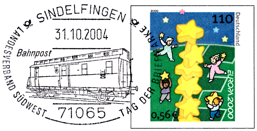 Sonderstempel aus Sindelfingen vom 31.10.2004 zum Tag der Briefmarke mit einem Bahnpostwagen im Stempelbild auf einem Plusbrief im Format 220x110 mm ohne Fenster und ohne Druckvermerk (MiNr USo 21 A I).