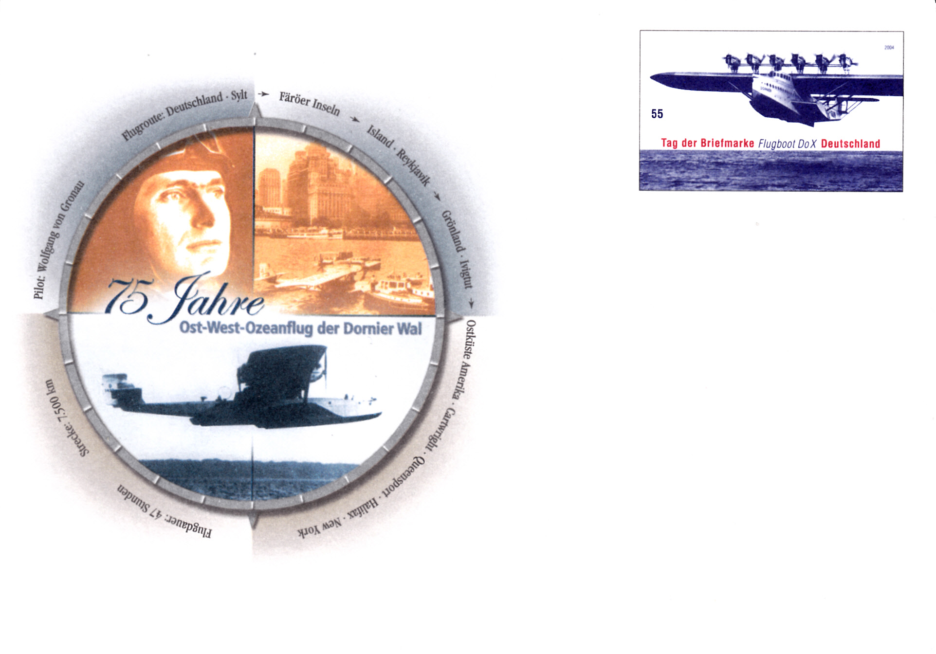 Dieser Gedenkumschlag (MiNr USo 100) zum Jubiläum "75 Jahre Ost-West-Ozeanflug der Dornier Wal" hat einen Wertstempel "Tag der Briefmarke 2004" (MiNr 2428).