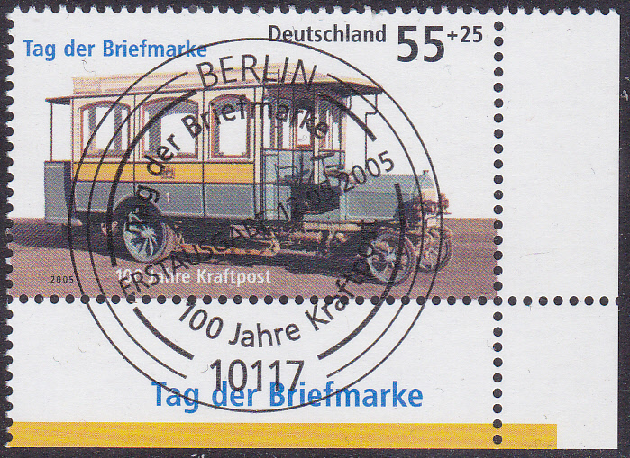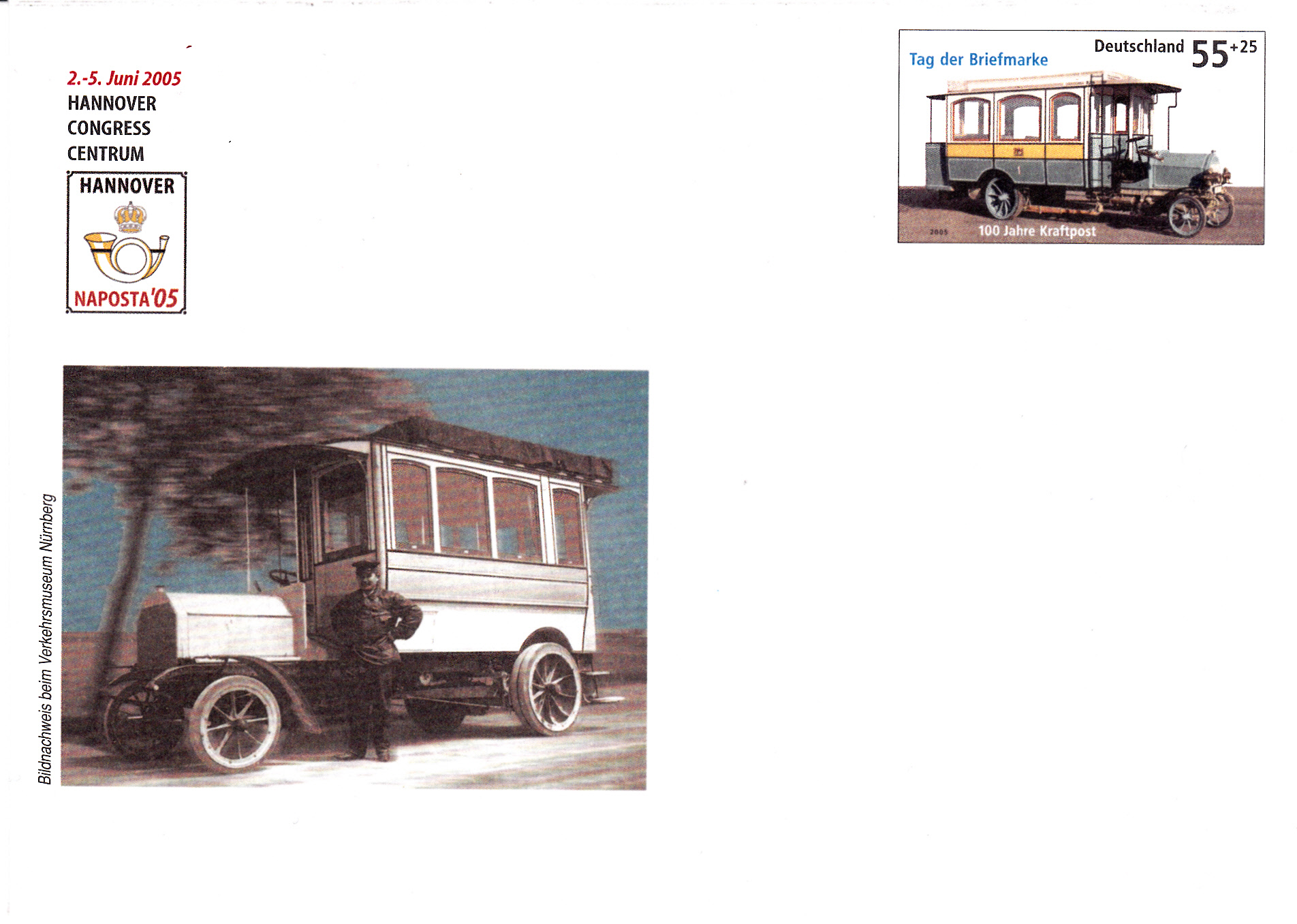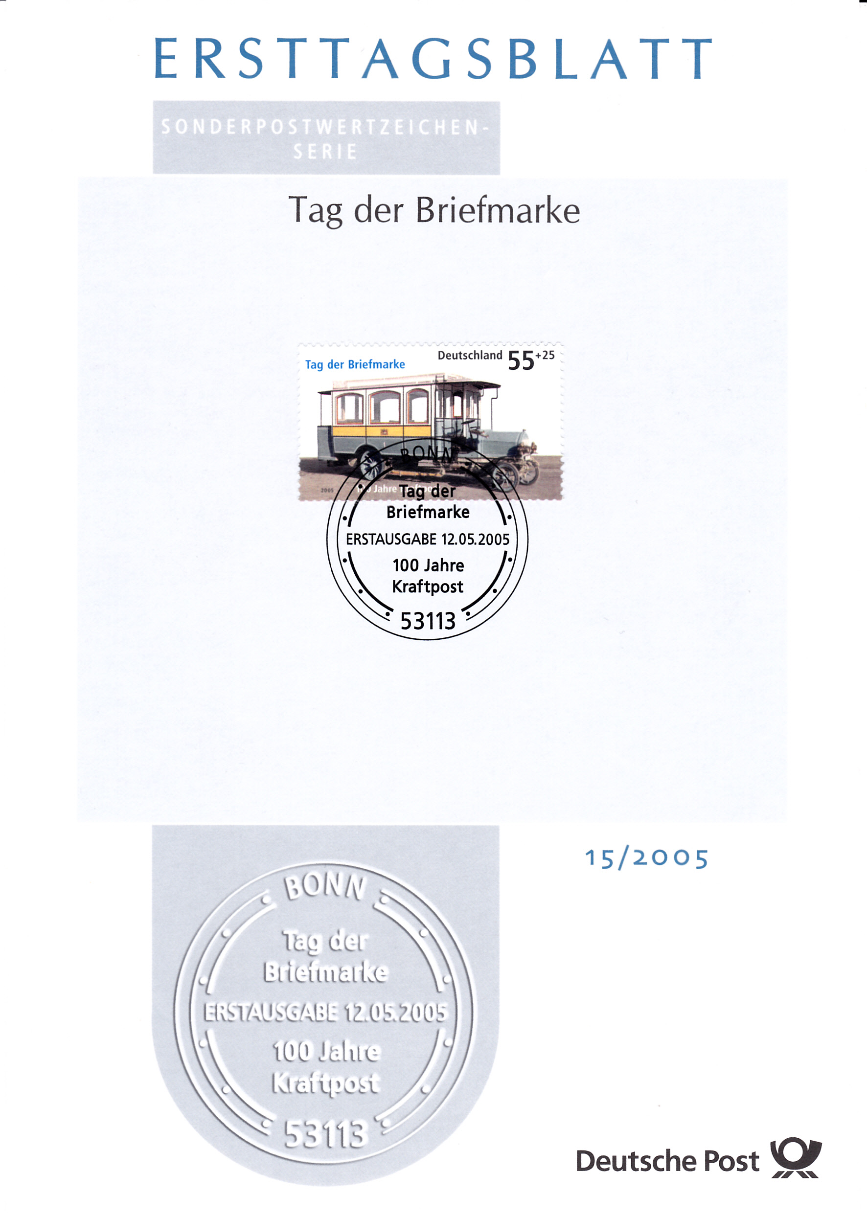 Die Marke zum Tag der Briefmarke 2005 (MiNr 26456) erschien bei der Deutschen Post AG am 12.52005 und steht unter dem Thema "100 Jahre Kraftpost". Sie zeigt im Markenbild einen Kraftpostomnibus von 1905.