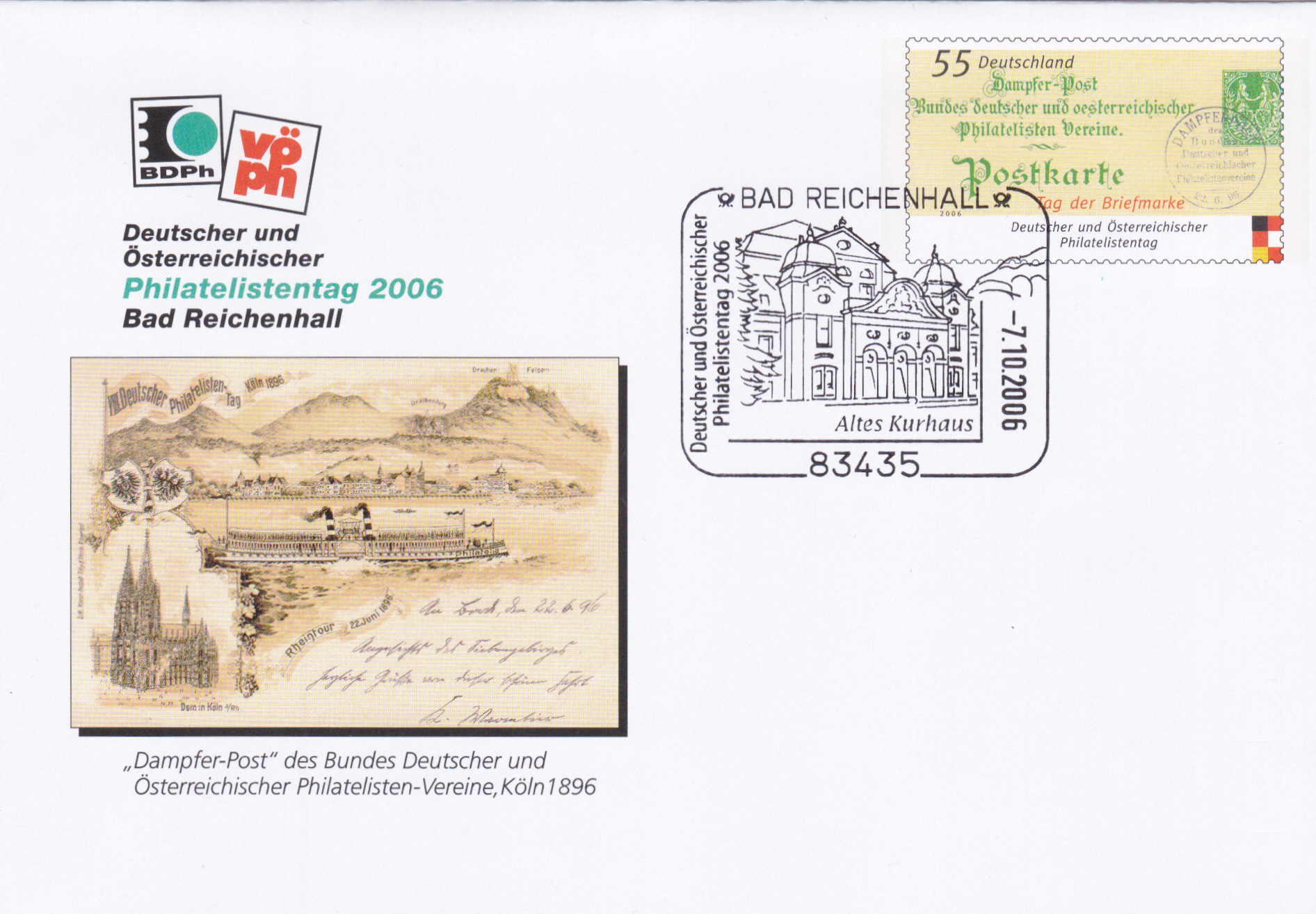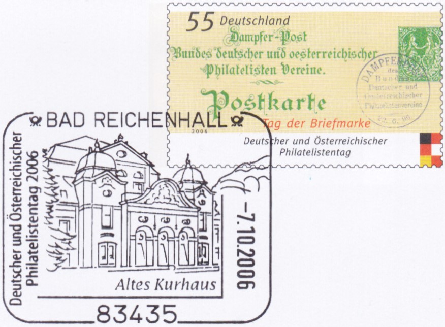 Den hier bereits gezeigten Ganzsachenumschlag (MiNr USo 122) mit dem Wertstempel "Tag der Briefmarke" 2006 zeige ich hier mit dem passenden Sonderstempel zum Philatelistentag 2006 vom 7.10.2006 aus Bad Reichenhall.