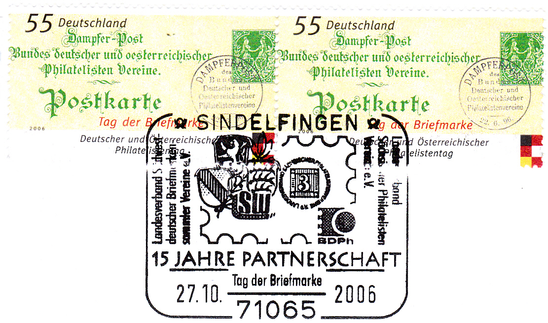 Per Einschreiben gelaufener Brief mit dem Sonderstempel vom 27.10.2006 aus Sindelfingen zum Tag der Briefmarke 2006 der Landesverbände Südwest und Sachsen.