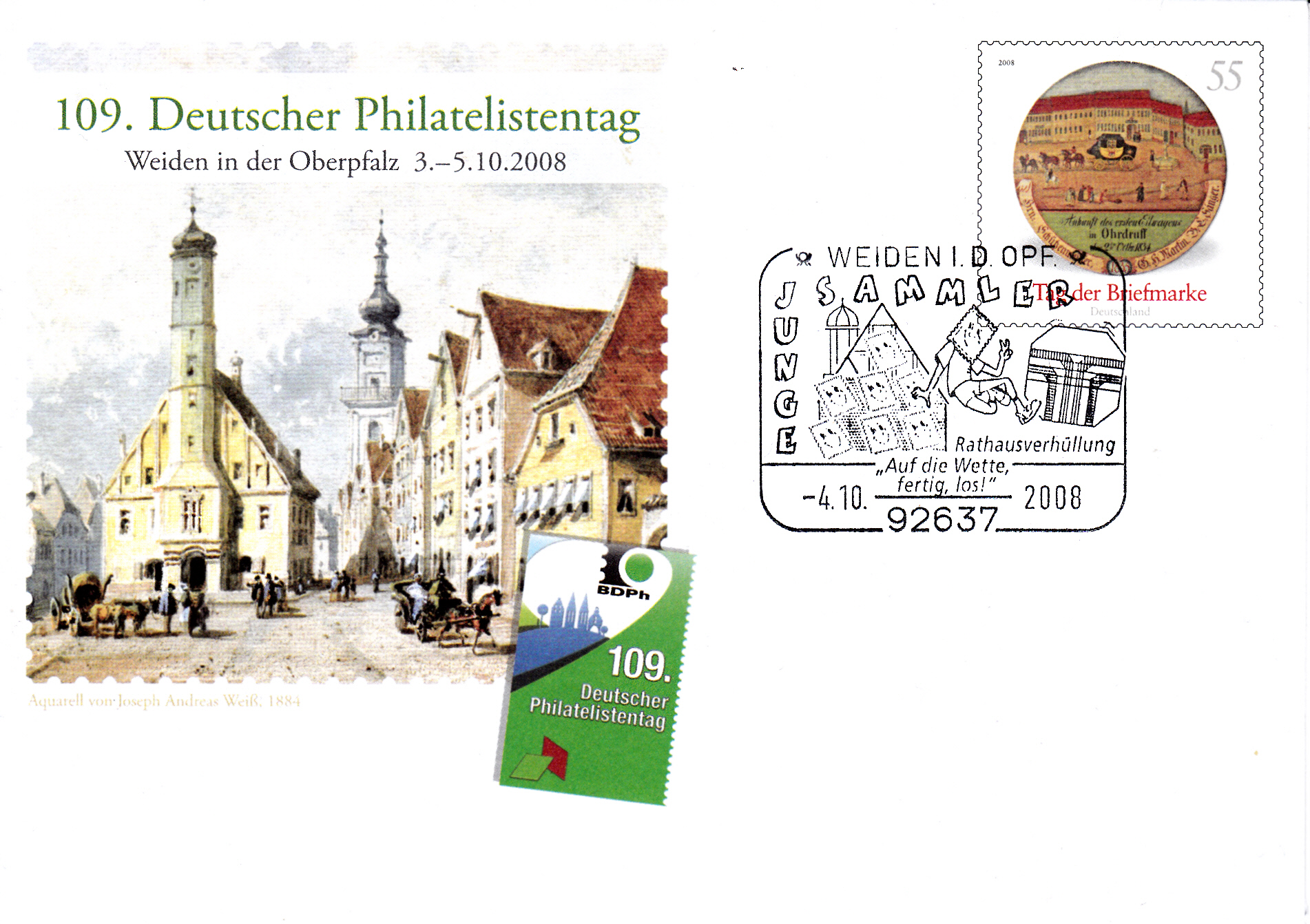 Dieser zum 109. Deutschen Philatelistentag in Weiden erschienene Sonderumschlag (MiNr USo 162) mit dem Wertzeicheneindruck der Marke zum Tag der Briefmarke 2008 (MiNr 2692) wurde mit einem passenden Sonderstempel während des Philatelistentages gestempelt.