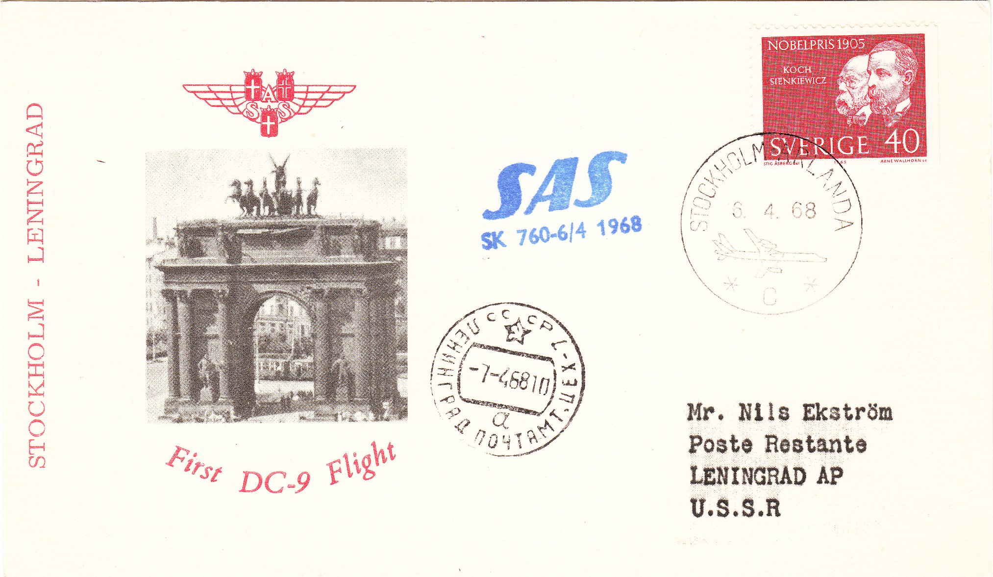 Dieser Beleg dokumentiert den Erstflug einer DC-9 der SAS von Stockholm nach Leningrad am 06.04.1968: