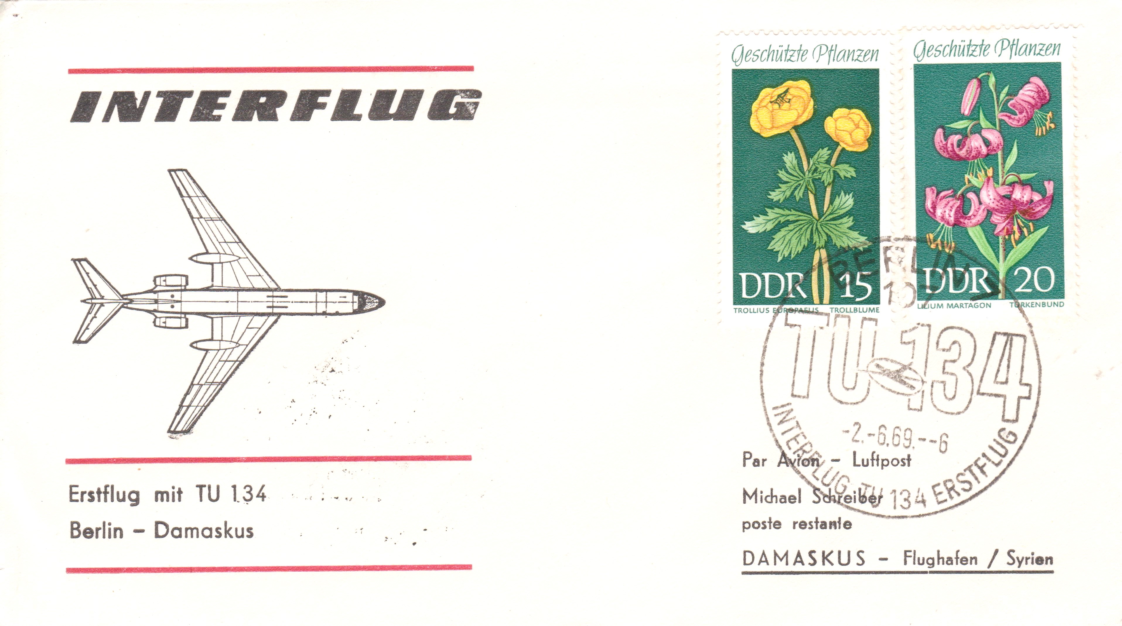 Dieser Beleg dokumentiert den Erstflug einer TU 134 am 02.06.1969 von BERLIN nach DAMASKUS: