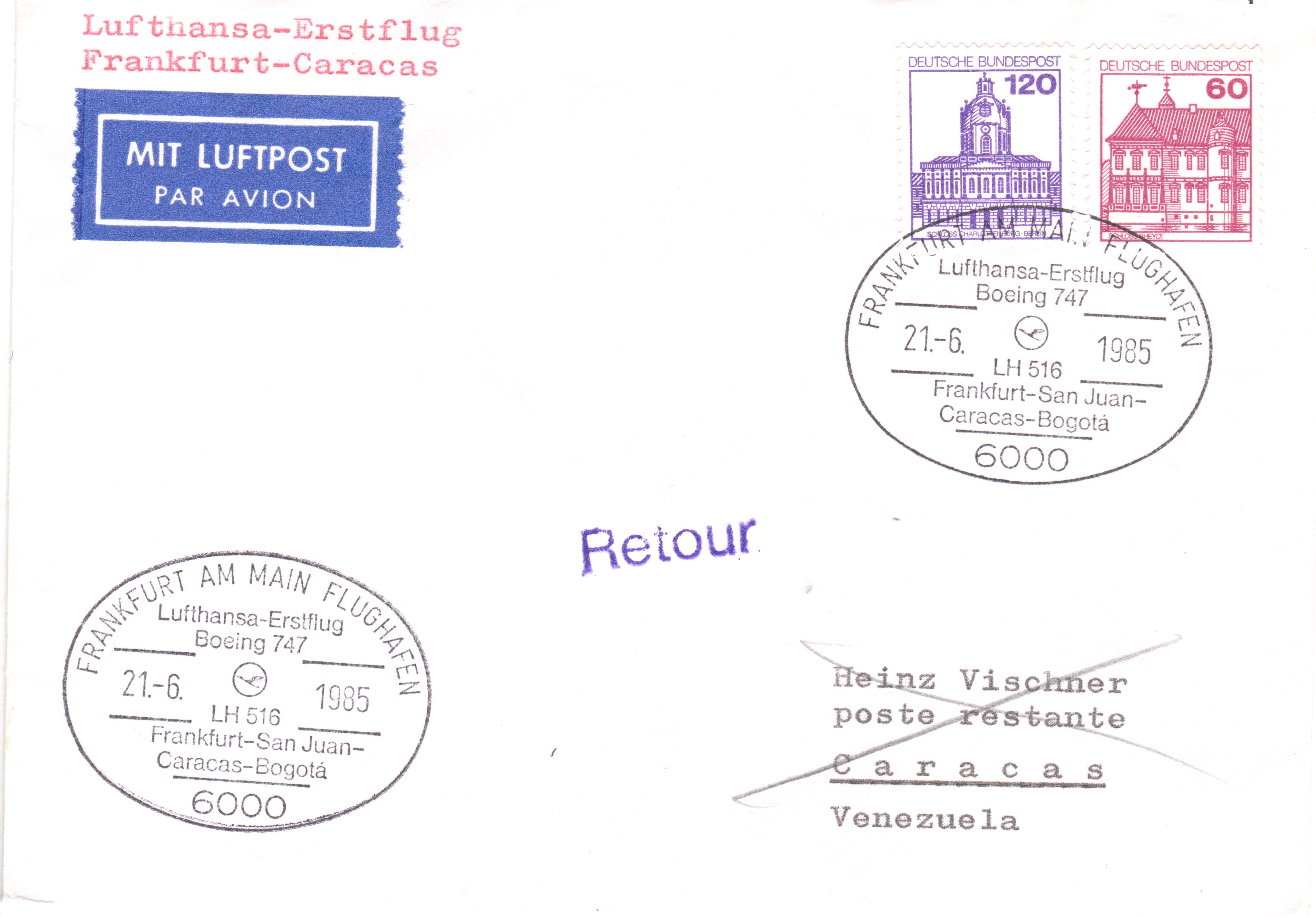 Diese Belege vom 05.04.1980 dokumentieren den Lufthansa Erstflugs LH 508 Frankfurt - Rio de Janeiro - Sao Paulo - Buenos Aires mit einer BOEING 747 SL am 05./06.04.1988: