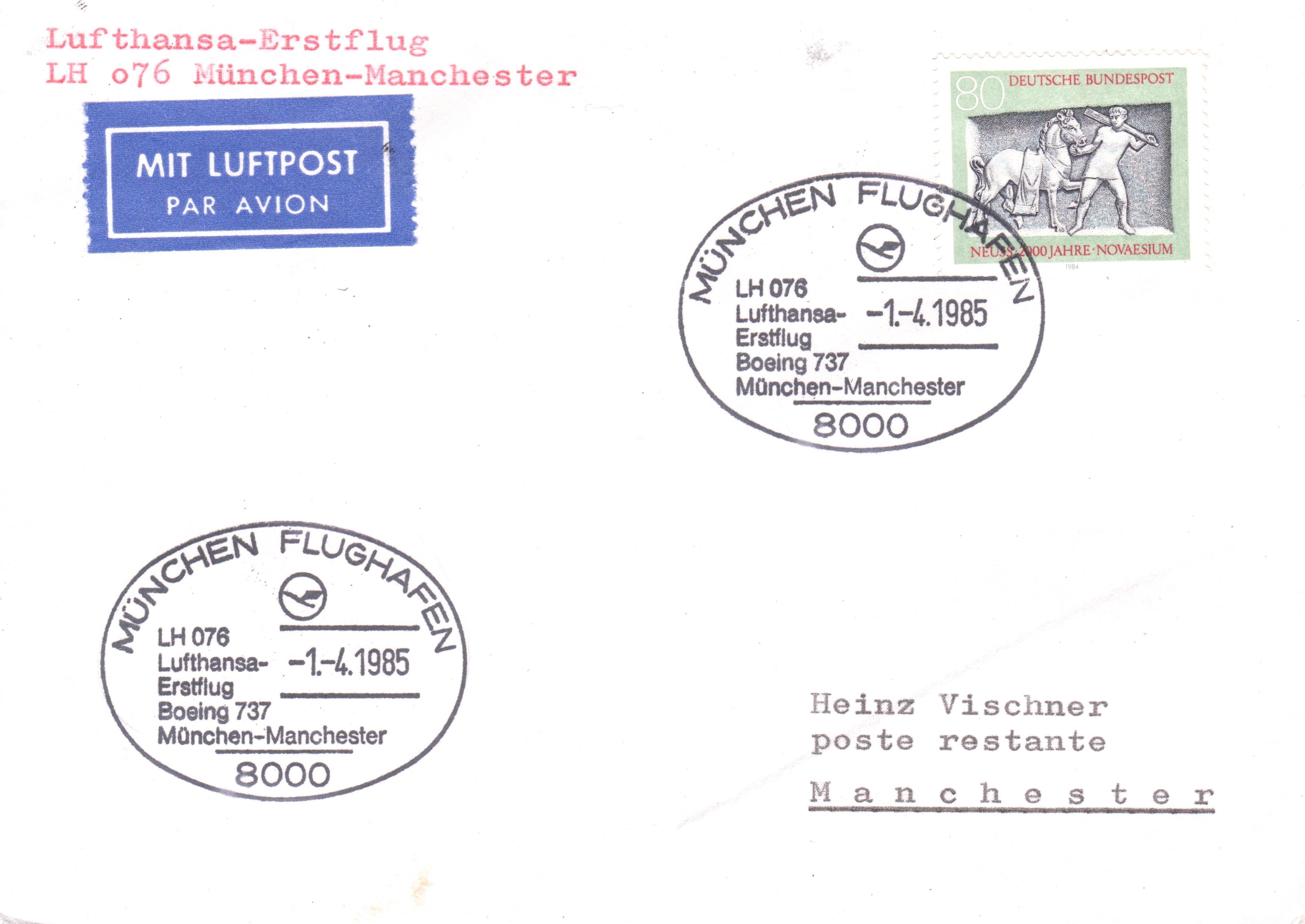 Dieser Beleg dokumentiert am 01.04.1985 den Erstflug einer BOEING 737 der Lufthansa von München nach Manchester: