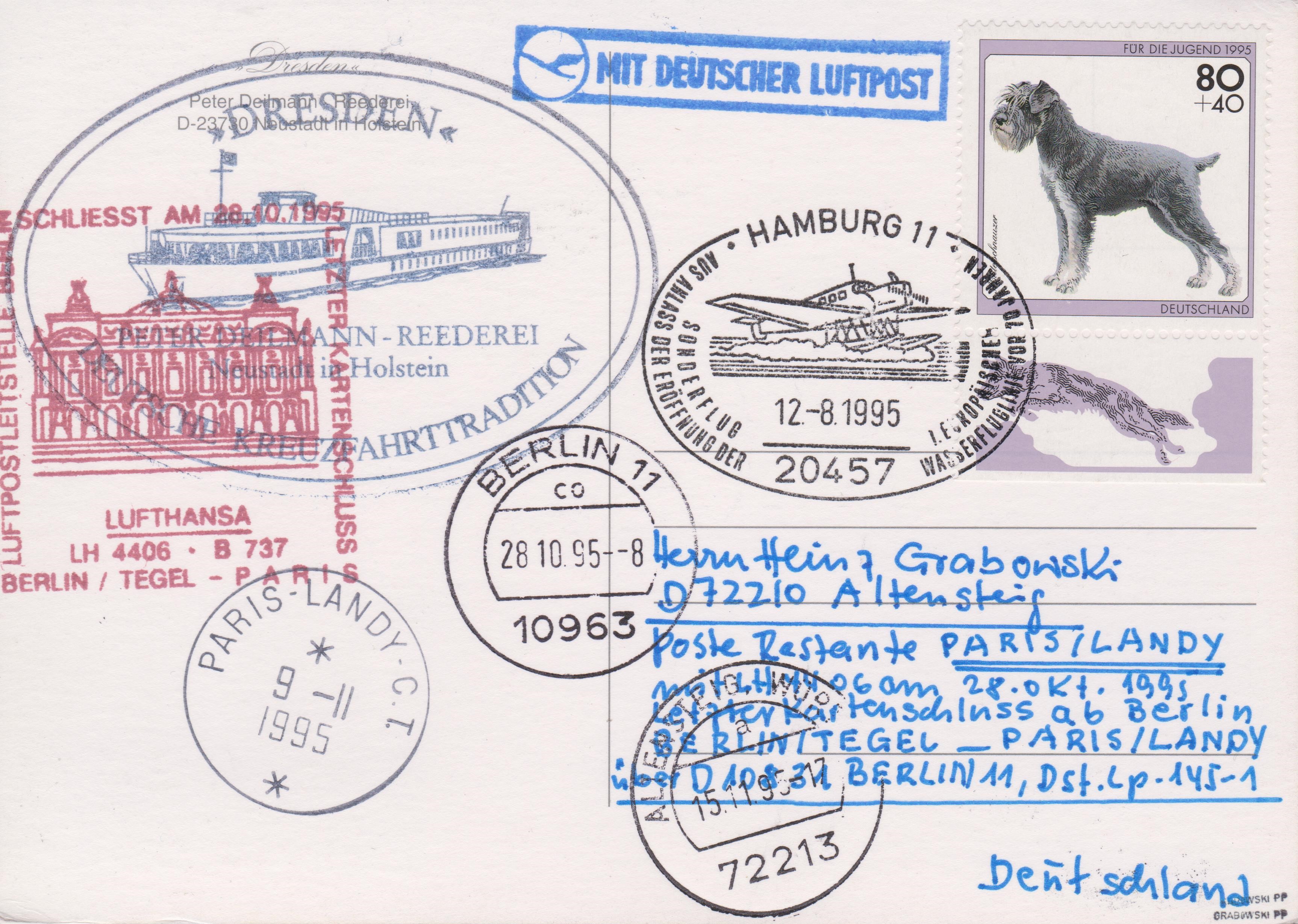 Der Beleg wurde der Adresse entsprechend am 28.10.1995 zum letzten Kartenschluss der Luftpostleitstelle Berlin mit einer B 737 = Boeing 737 von Berlin/Tegel nach Paris geflogen.