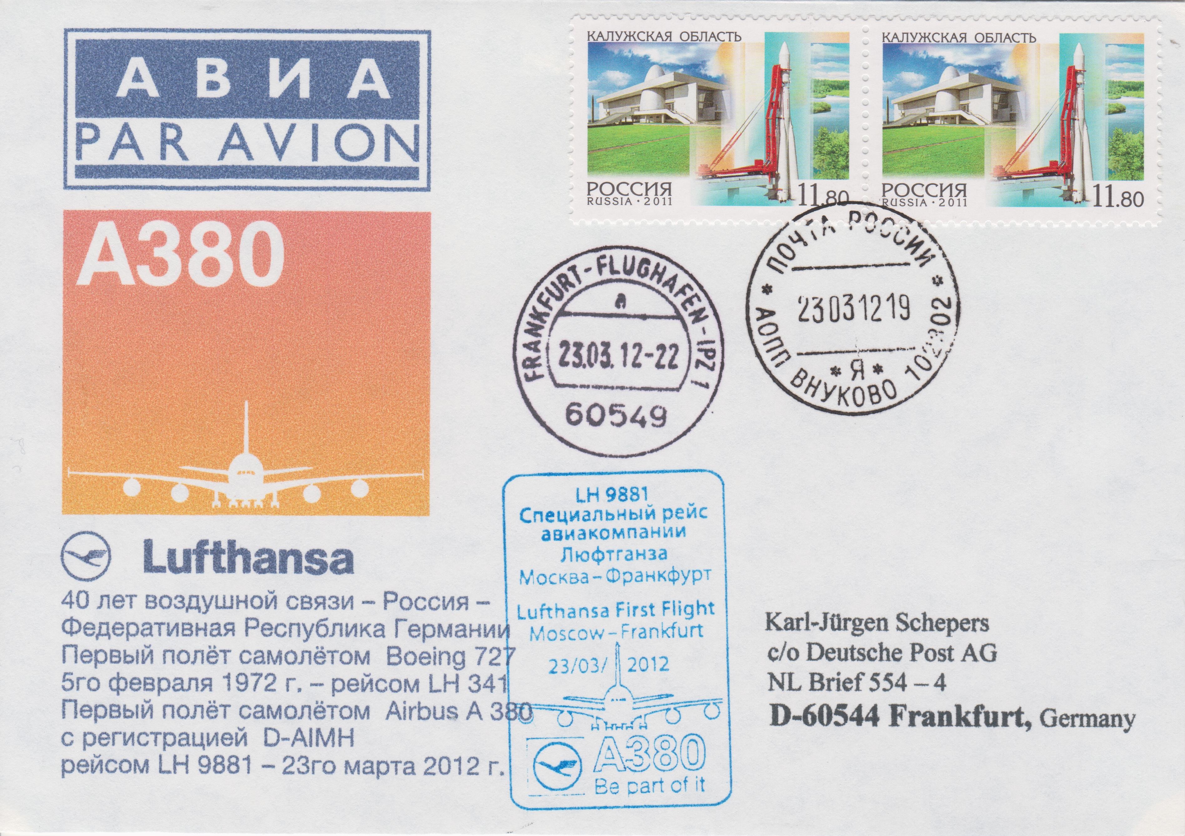 Dieser Beleg wurde am 23.03.2012 mit einem Airbus A380 auf dem Erstflug der Lufthansa von Moskau nach Frankfurt befördert, was ein Ankunftstempel FRANKFURT-FLUGHAFEN dokumentiert: