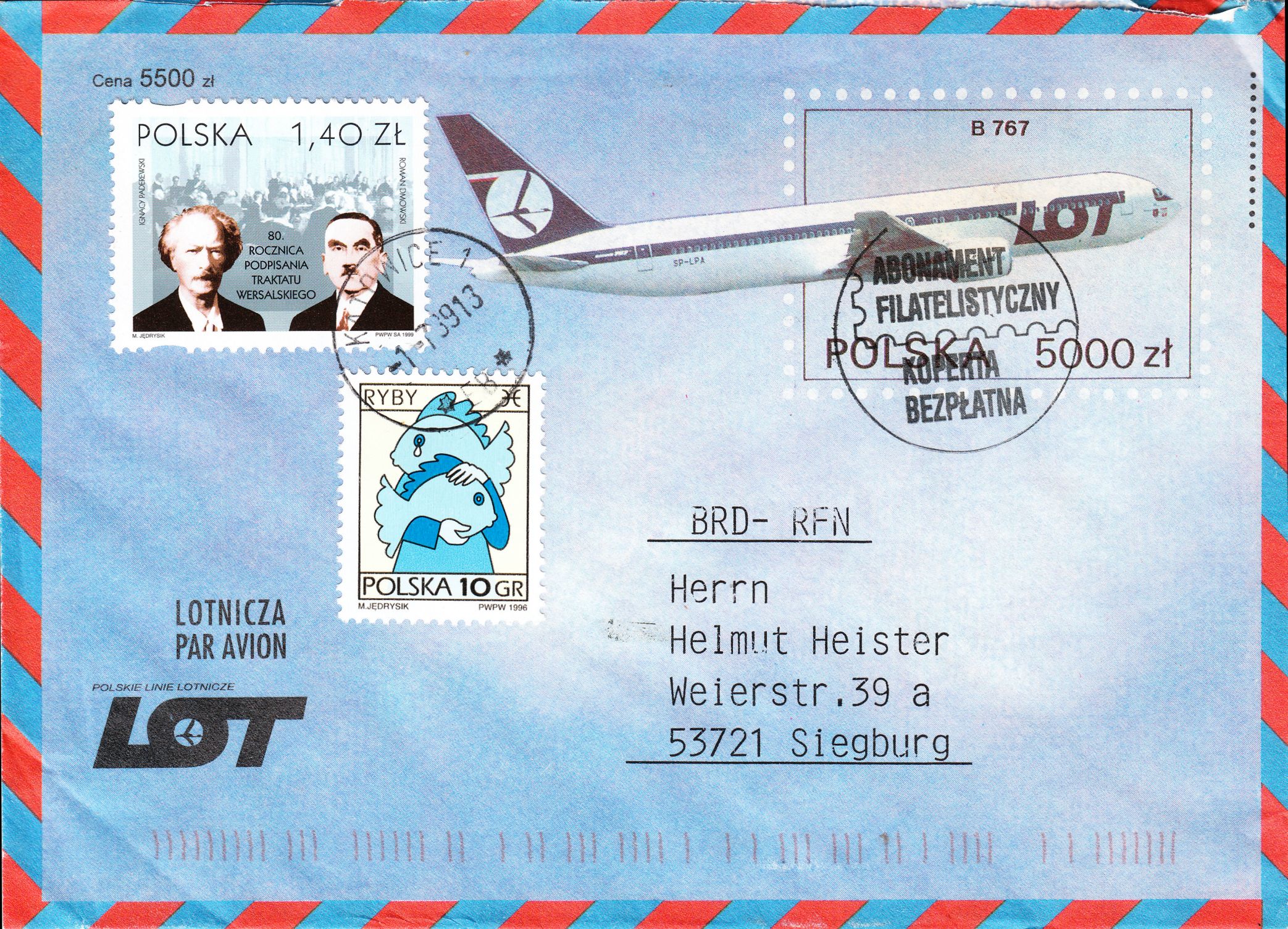Diese polnische Ganzsache zeigt eine BOEING 767 der polnischen Fluggesellschaft LOT mit der Kennung SP-LPA: