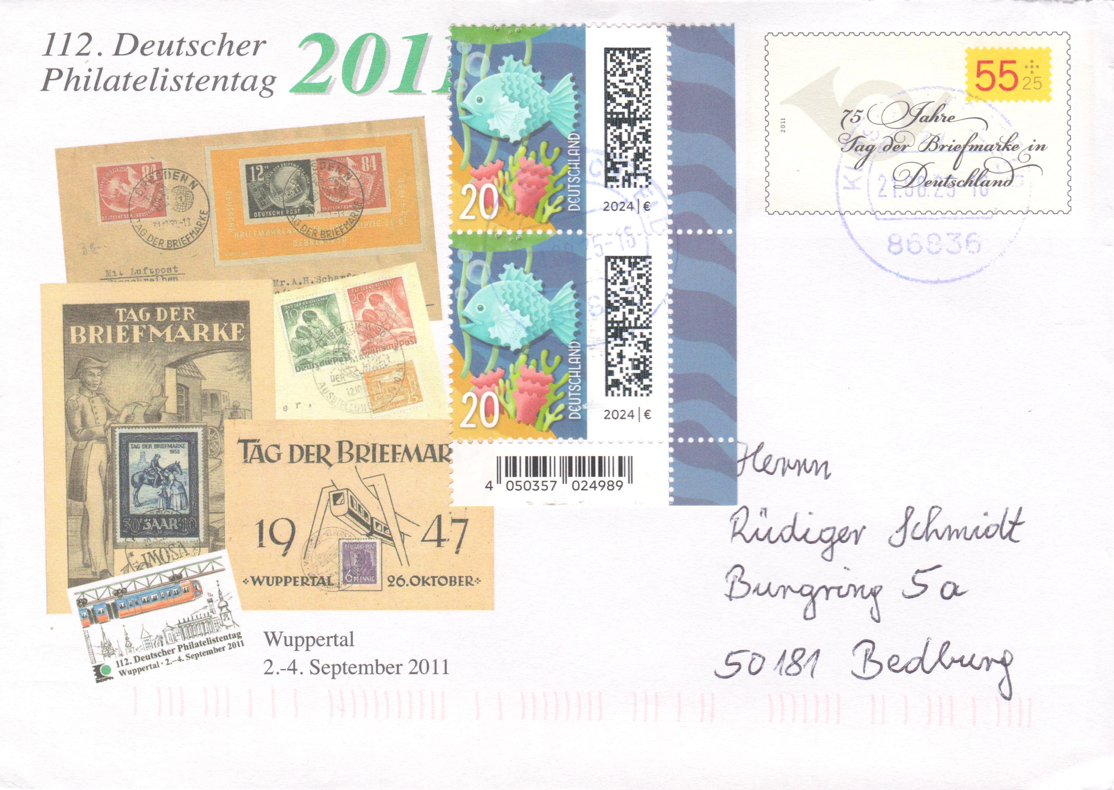 Spätverwendung des Sonderumschlags (MiNr. USo 244) zum 112. Deutschen Philatelisten-Tag mit dem Wertstempel "75 Jahre Tag der Briefmarke" mit Zusatzfrankatur am 21.08.2025: