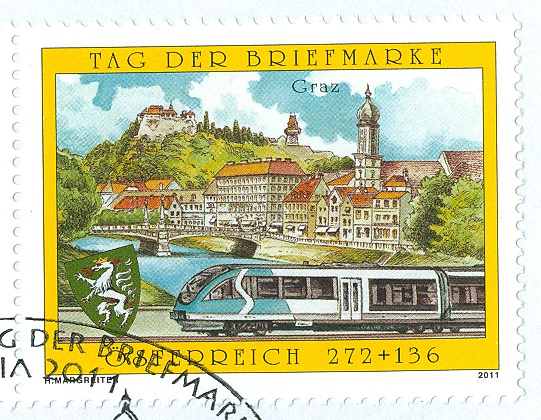 Hier zeige ich eine postfrische Marke zum Tag der Briefmarke 2011 (MiNr 2936). Sie zeigt eine Stadtansicht von Graz und einen Triebwagen Typ Desiro der S-Bahn Graz.