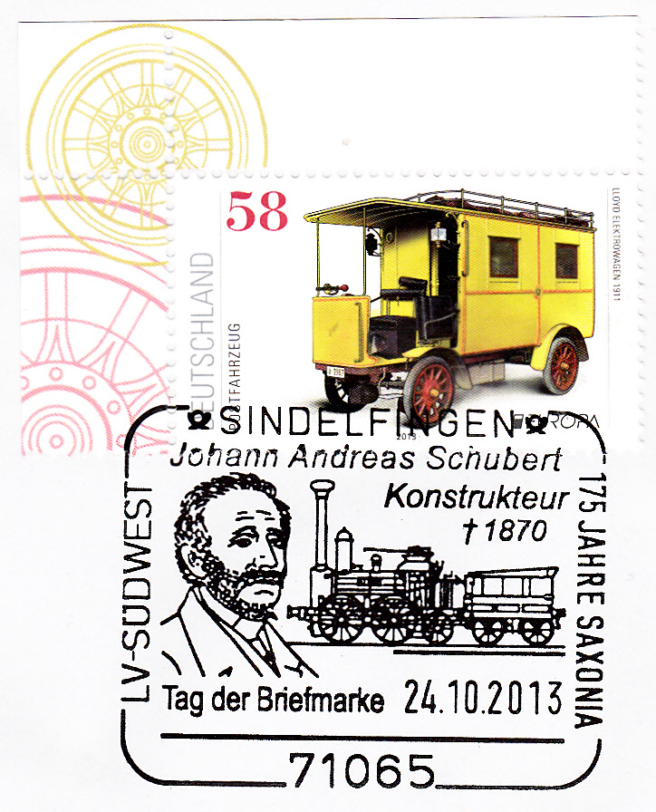 Sonderstempel aus Sindelfingen vom 24.10.2013 zum Tag der Briefmarke 2013. Im Stempelbild sehen wir Johann Andreas Schubert und die von ihm konstruierte Dampflokomotive "Saxonia".
