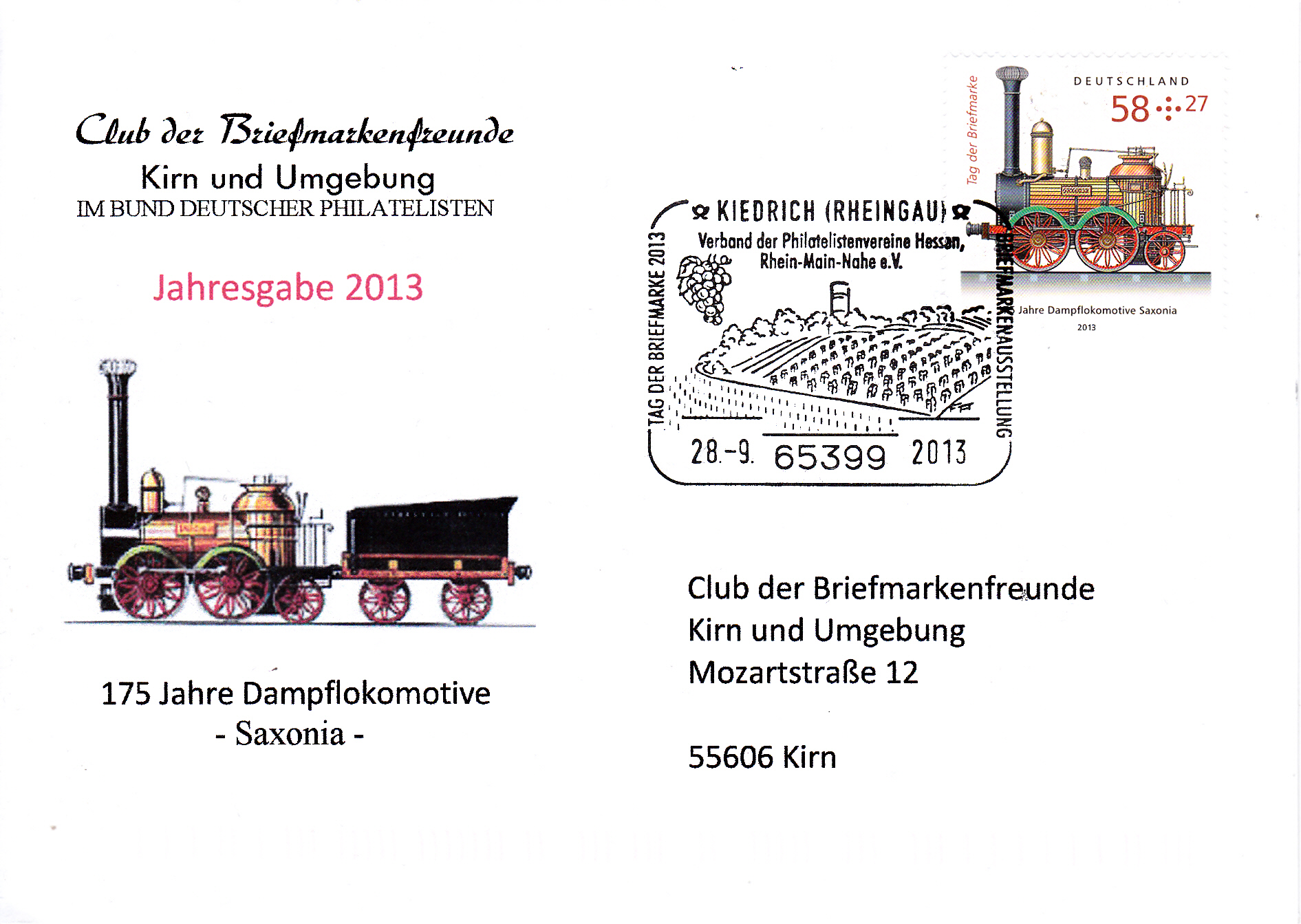 Zum Tag der Briefmarke 2013 ist bei der Deutschen Post am 5.9.2013 eine Marke mit Zuschlag (MiNr 3027) mit der Abbildung der Dampflokomotive "Saxonia" aus dem Jahre 1843 von Johann Andreas Schubert (1808-1870, Ingenieur und Unternehmer).
