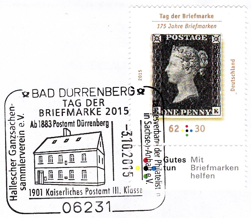 Sonderstempel aus Bad Dürrenberg vom 3.10.2015 zum Tag der Briefmarke 2015. Im Stempelbild das Gebäude, in dem ab 1883 das Postamt Dürrenberg untergebracht war.