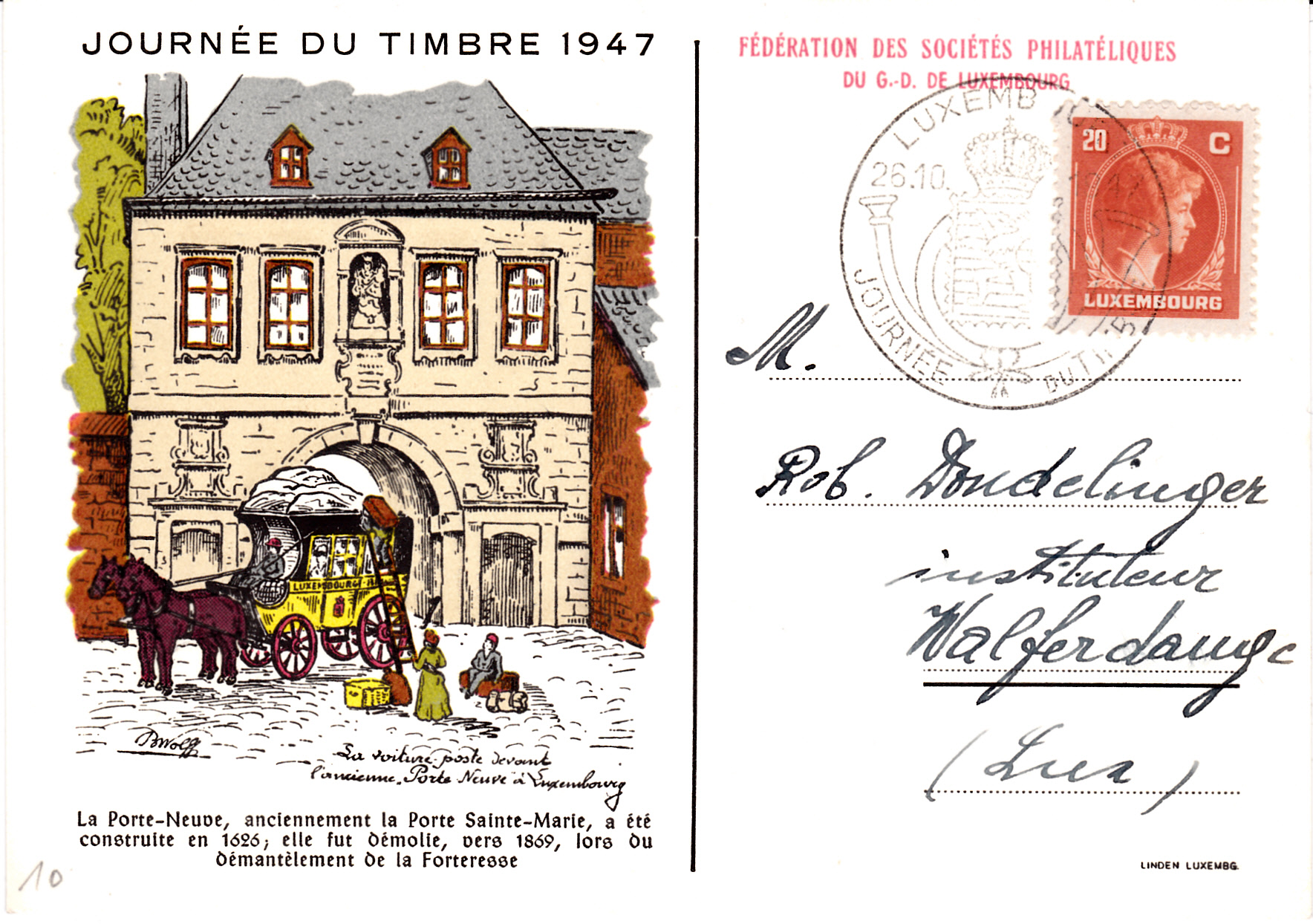 Postkarte der Federation des Sociétés Philatéliques dU G.-D. de Luxembourg mit dem Sonderstempel zum Tag der Briefmarke vom 26.10.1947 aus Luxembourg.