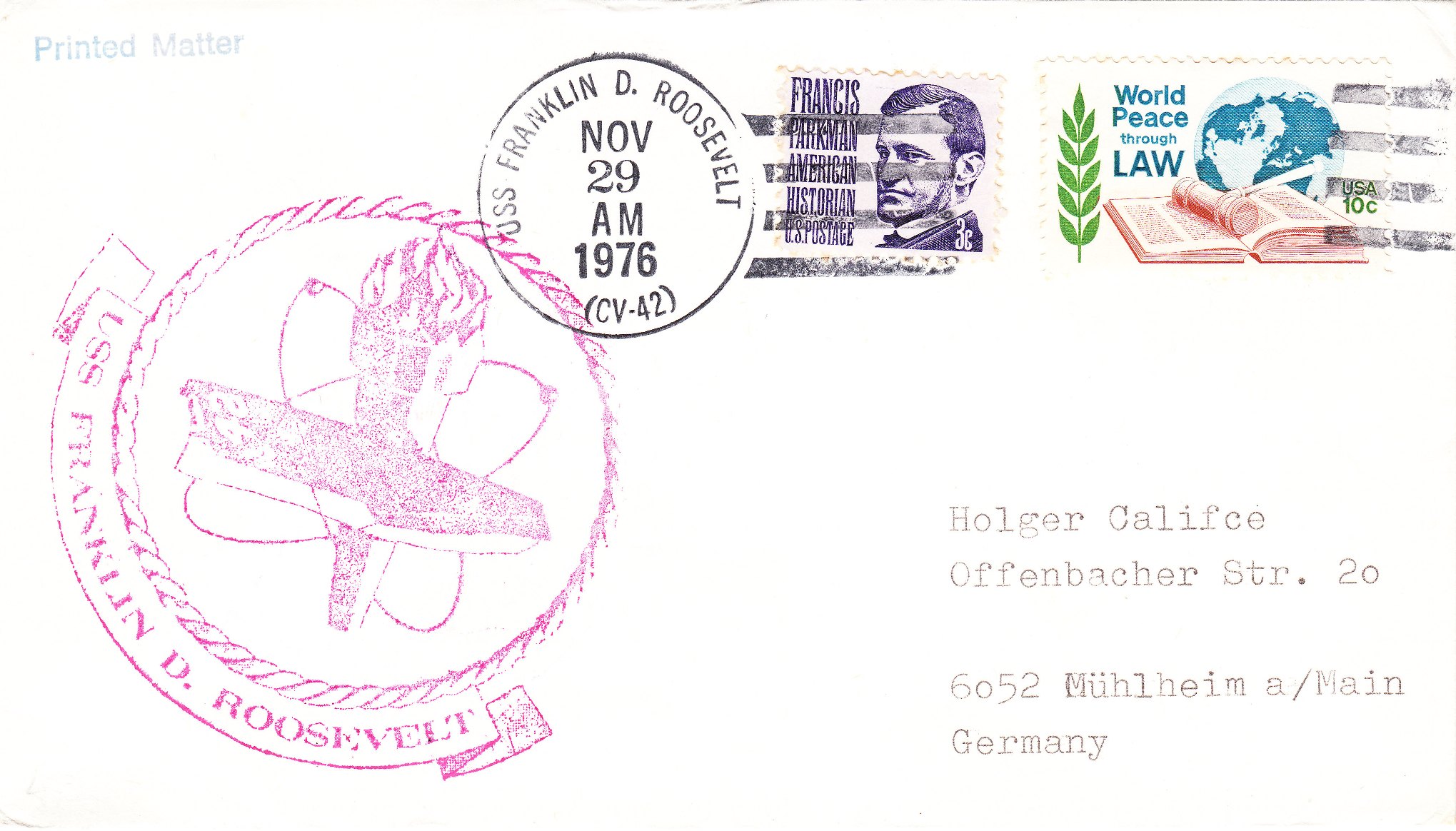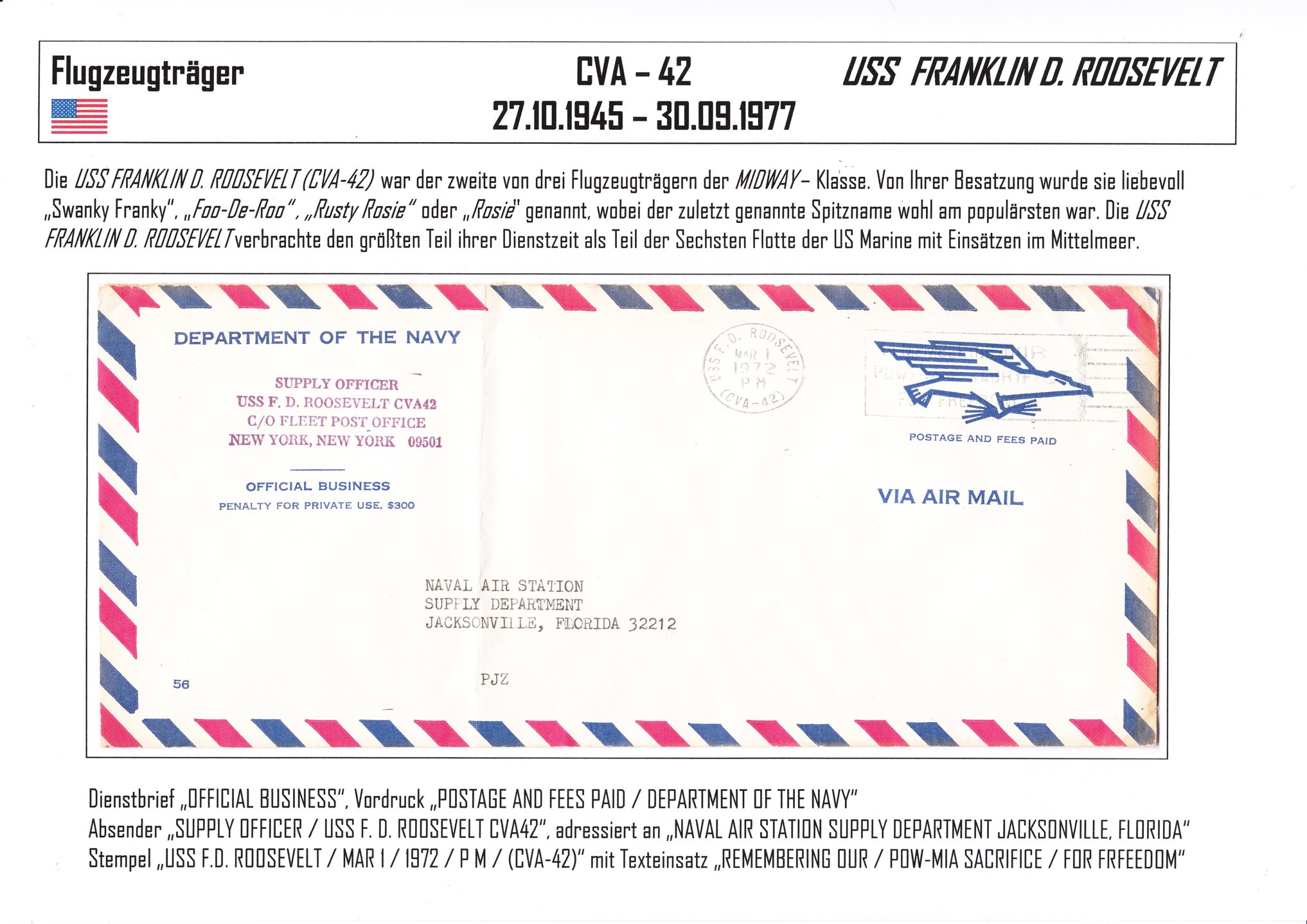 Dienstbrief mit Absender "SUPPLY OFFICER USS F. D. ROOSEVELT CVA42" sowie Bordstempel vom 01.03.1972, ebenfalls mit der Kennung CVA-42:
