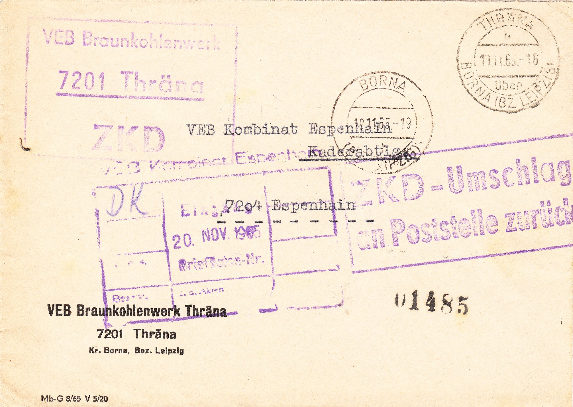 Dieser Brief vom VEB Braunkohlenwerk Thräna wurde am 18.11.1965 aufgegeben und portofrei per ZKD = Zentraler Kurierdienst in der DDR befördert: