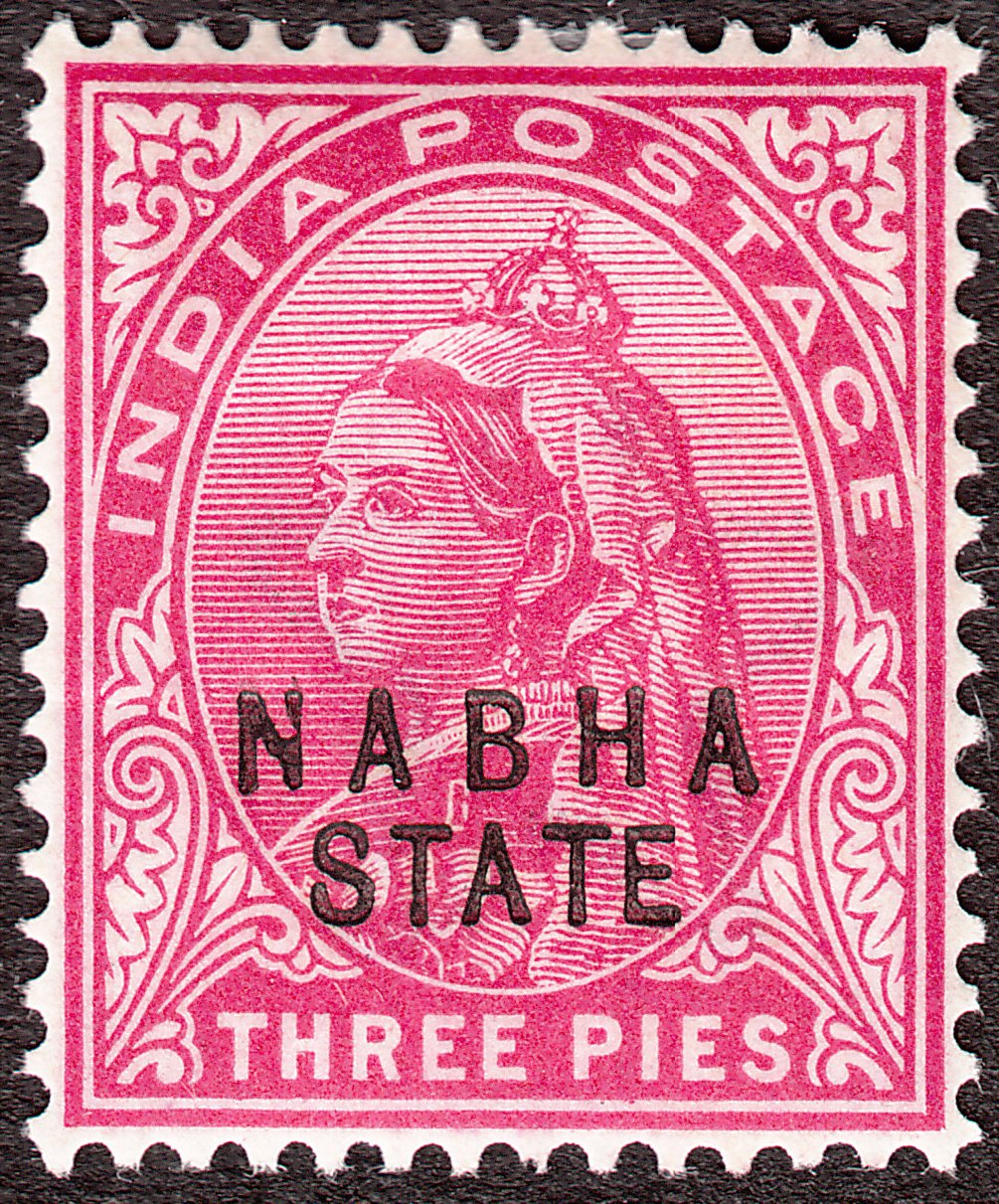 Diese Ausgabe erschien im November 1900 mit Aufdruck "NABHA STATE" in Schwarz auf Indien MiNr. 49: