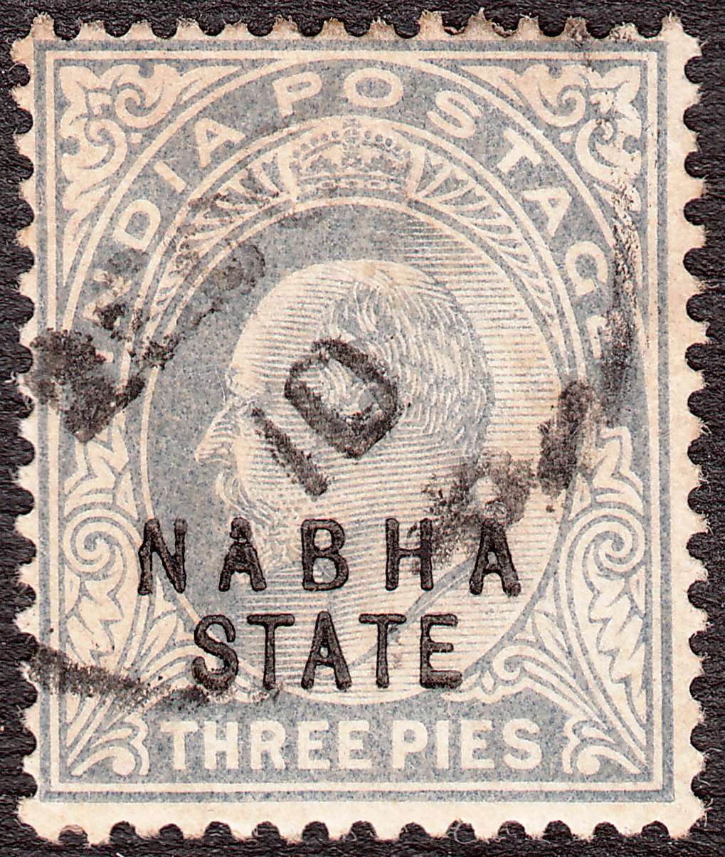 Dieses ist die Freimarke Indien MiNr. 55 mit zweizeiligem schwarzem Aufdruck "NABHA STATE":