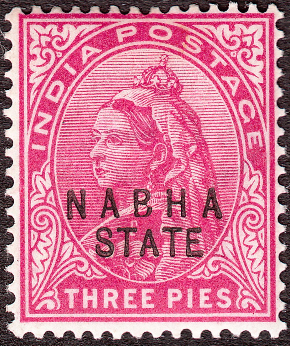 Diese Ausgabe erschien im November 1900 mit Aufdruck "NABHA STATE" in Schwarz auf Indien MiNr. 49: