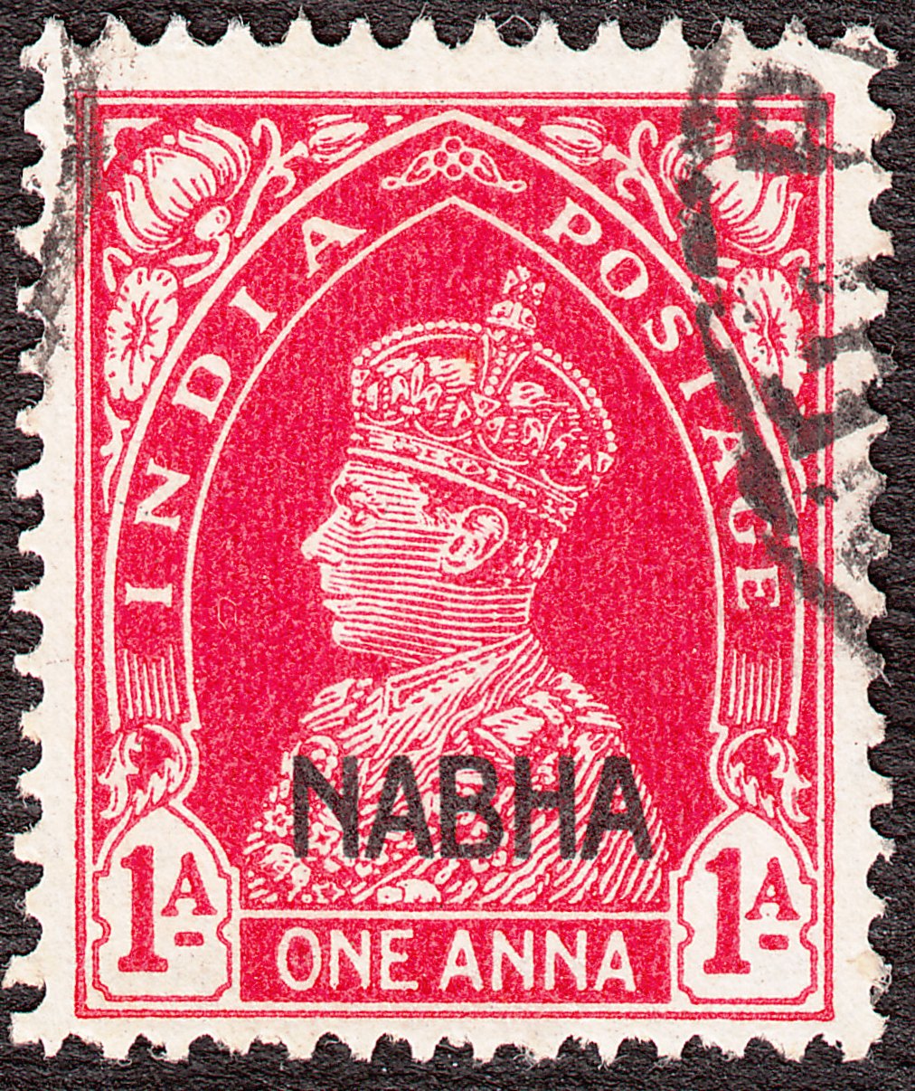 Die 1937 erschienene Freimarke Indien MiNr. 149 wurde am 30.05.1942 mit schwarzem Aufdruck "NABHA" versehen ausgegeben und ist als als Nabha MiNr. 87 katalogisiert: