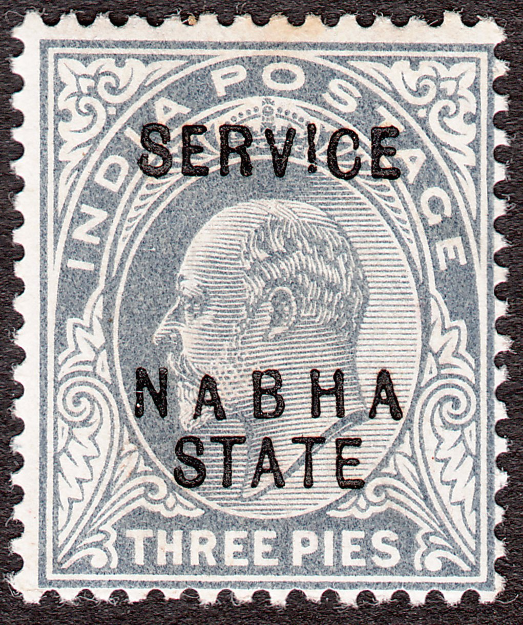 Die Originalmarke Indien MiNr. 55 wurde mit einem Aufdruck SERVICE NABHA STATE versehen als Dienstmarke MiNr. D 16 in Nabha ausgegeben: