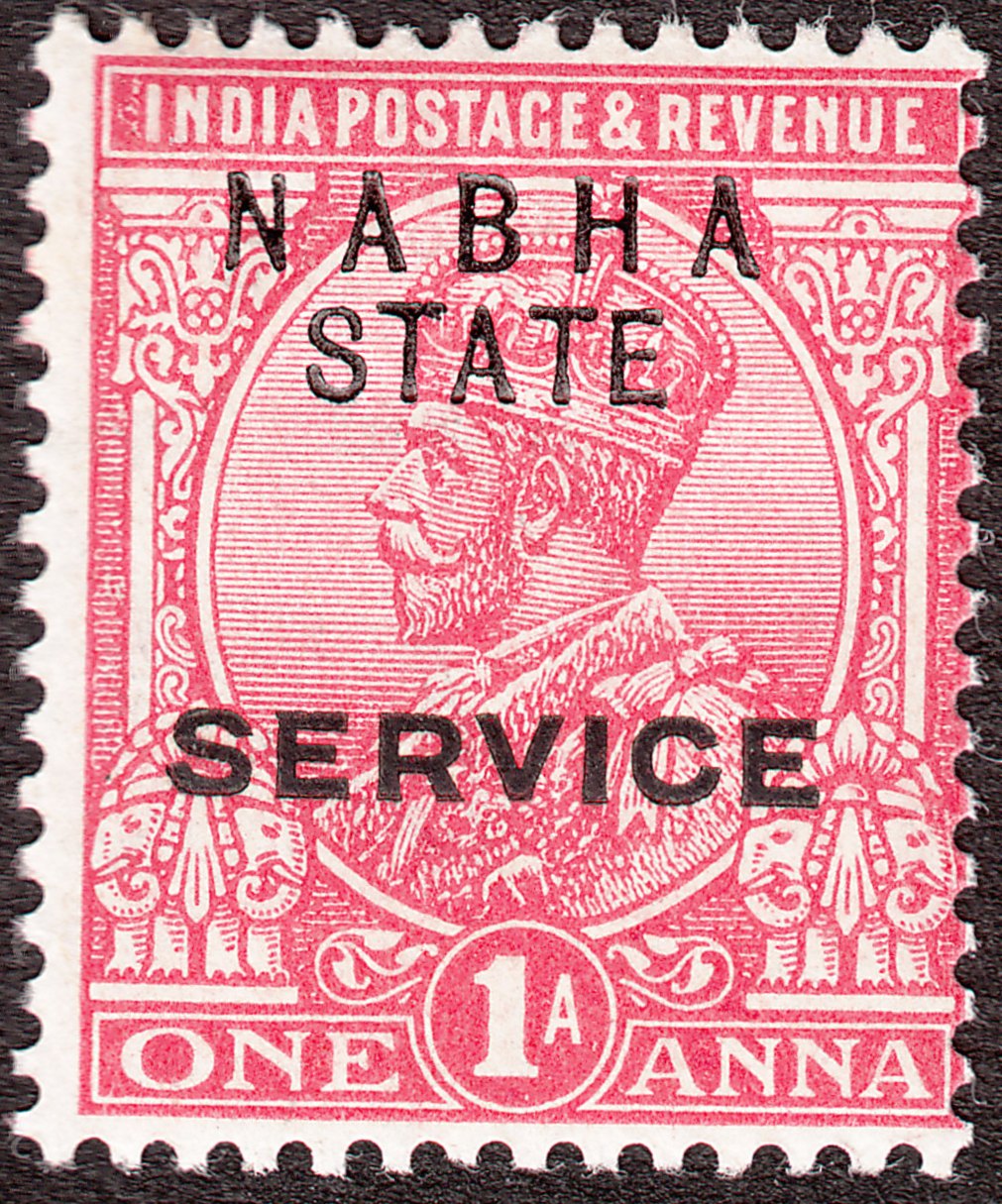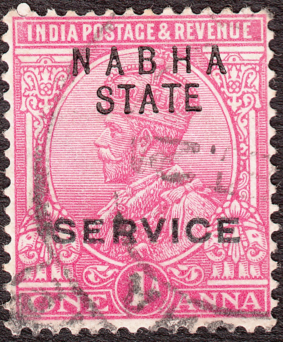 Die Originalmarke Indien MiNr. 77 wurde mit einem Aufdruck NABHA STATE SERVICE versehen als Dienstmarke MiNr. D 29 in Nabha ausgegeben: