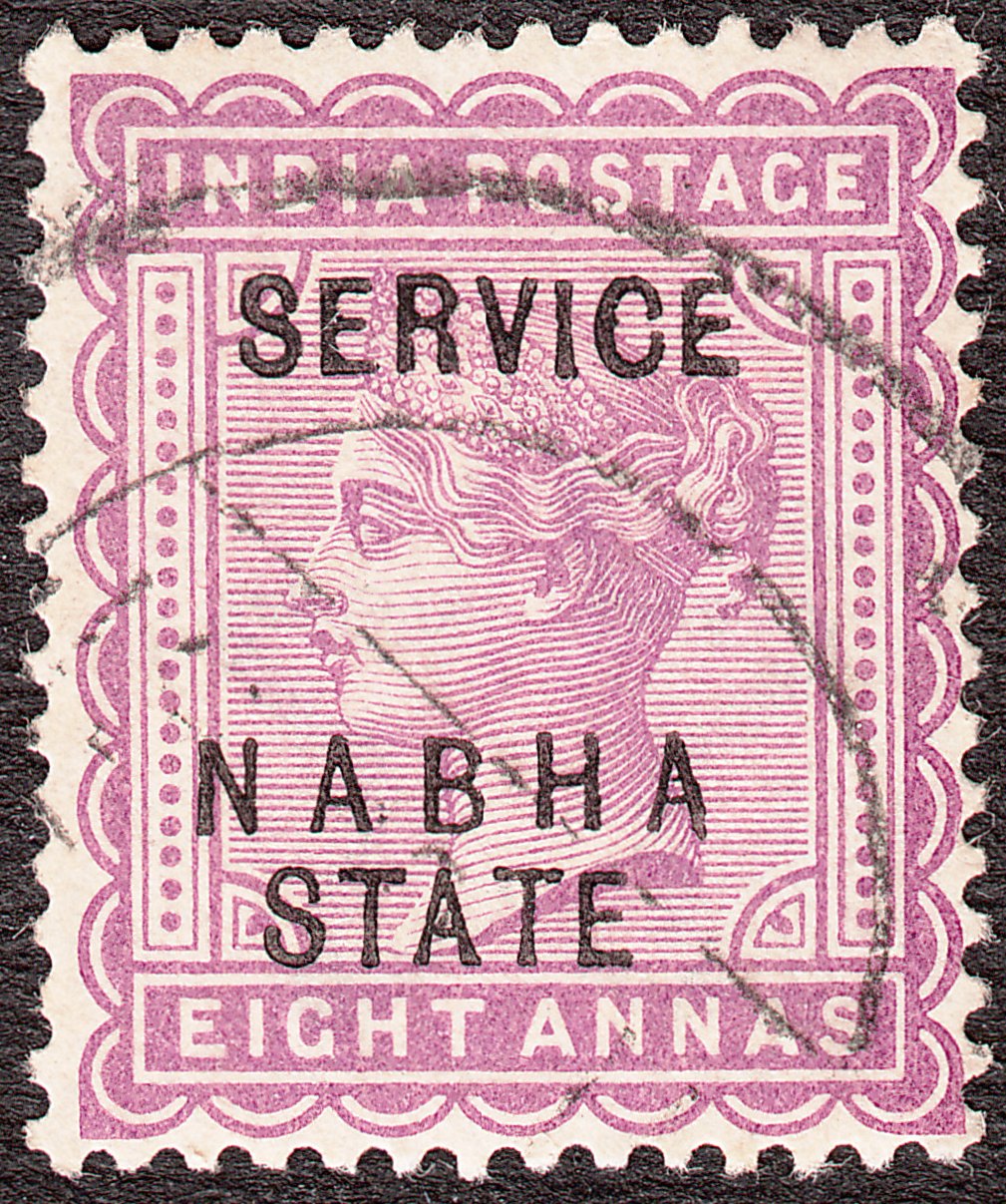 Die Freimarke Indien MiNr. 39 zu 8 Anna in lila wurde 1889 mit einem dreizeiligen schwarzen Aufdruck "SERVICE NABHA STATE" versehen als Dienstmarke Nabha MiNr. D 7 ausgegeben: