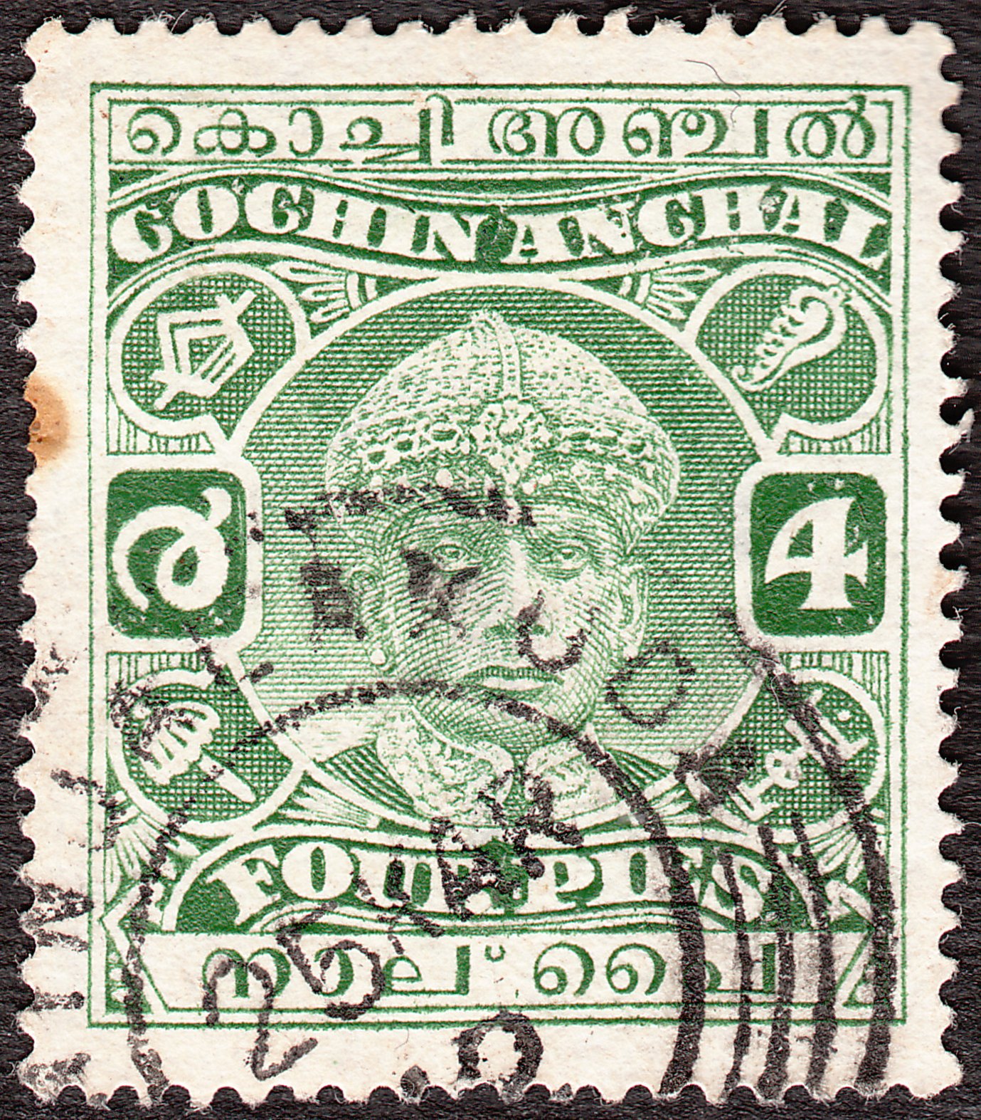 Die MiNr. 43 zu 4 Pies in dunkelgrün zeigt ein Kopfbild des Maharadscha Rama Varma (III.), der in Cochin von 1932 bis 1941 regierte: