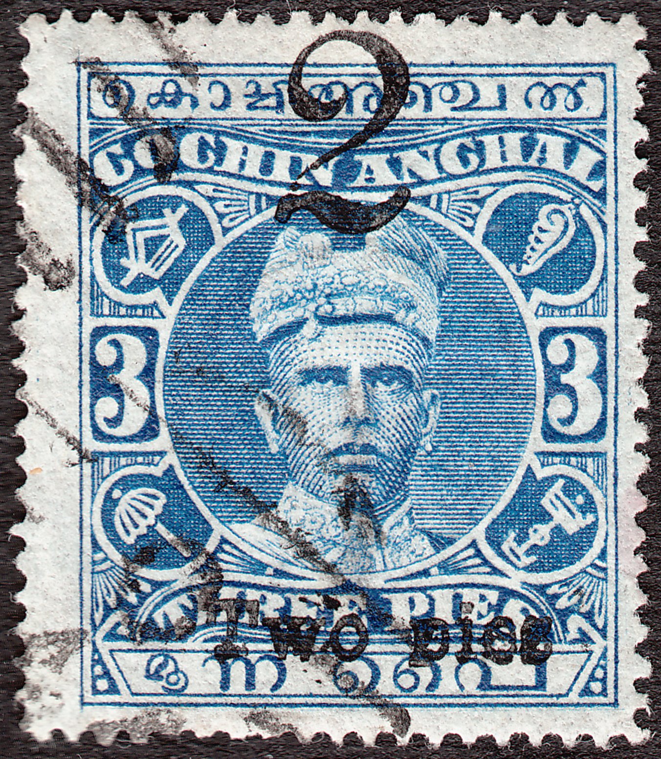 Die MiNr. 18 zu 3 Pies in blau mit dem Kopfbild von Radscha Sri Rama Varma, der in Cochin von 1895 bis 1914 regierte, wurde 1922 mit einem neuen Wertaufdruck "2 Two pies" versehen: