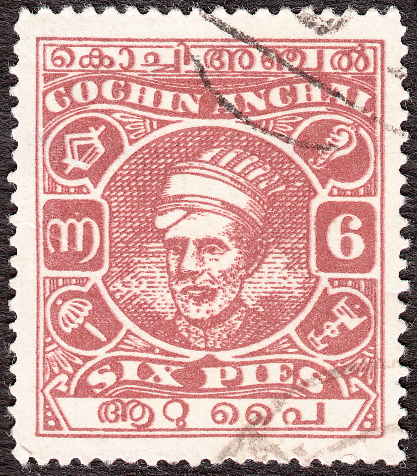 Die Freimarke Cochin MiNr. 71 zu 6 Pies in rotbraun zeigt ein Kopfbild des Maharadschas Kerala Varma (II.), der in Cochin von 1941 bis 1943 regierte: