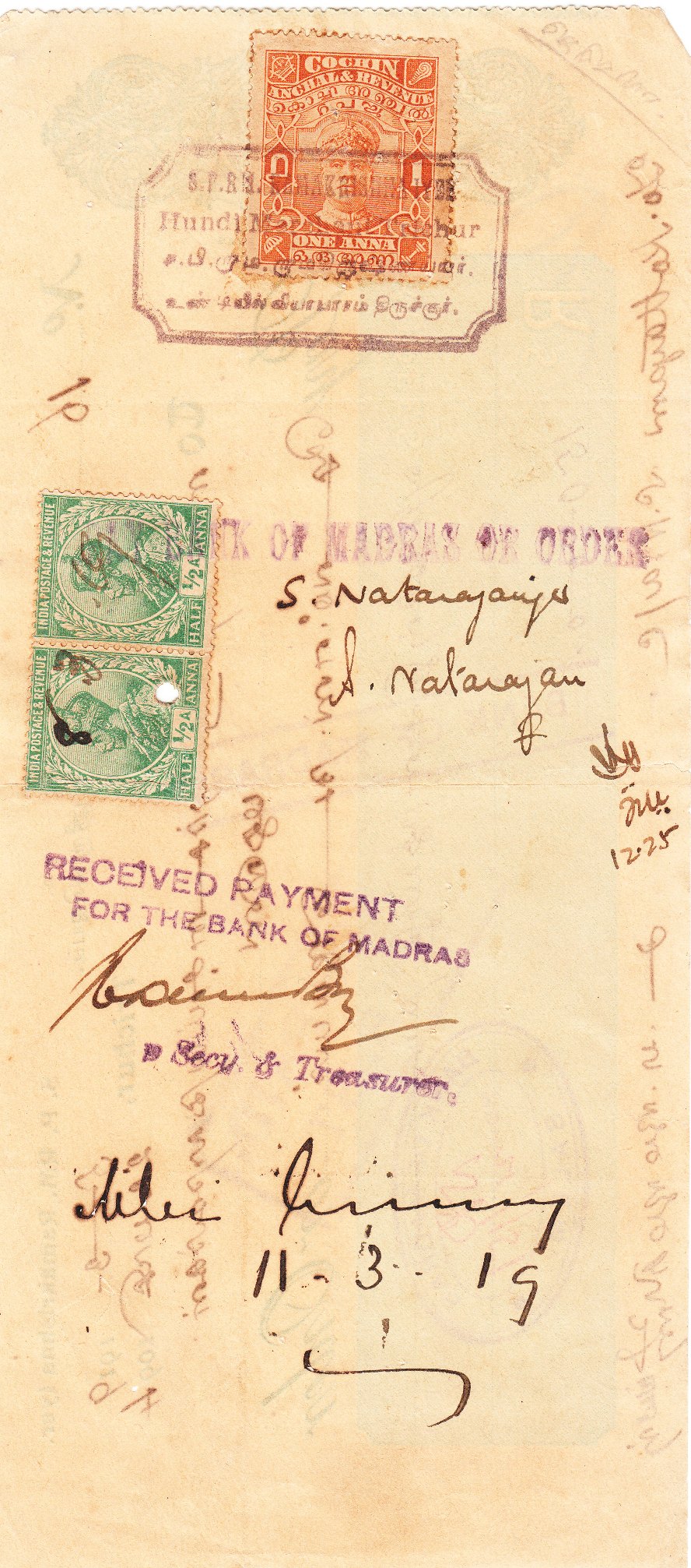 Dieser Beleg zeigt eine MiF einer Freimarke Cochin MiNr. 31 mit einem Paar der Freimarke Indien MiNr. 76: