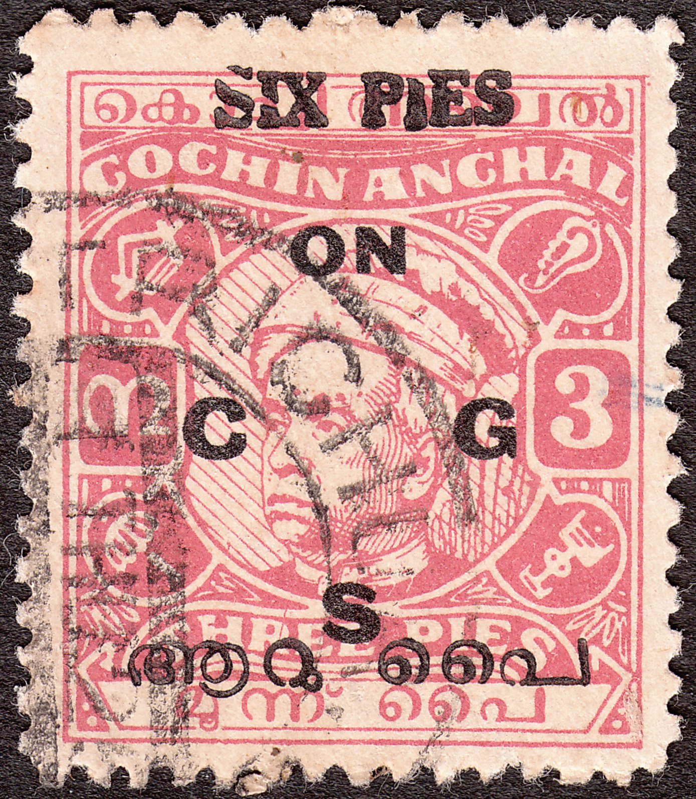 Die Freimarke Cochin MiNr. 94 wurde mit einem schwarzen Aufdruck "ON C G S" versehen als Dienstmarke Cochin MiNr. D 90 ausgegeben. Diese erhielt dann einen weiteren schwarzen Aufdruck "SIX PIES" und erschien 1949 als Dienstmarke Cochin MiNr. D 98: