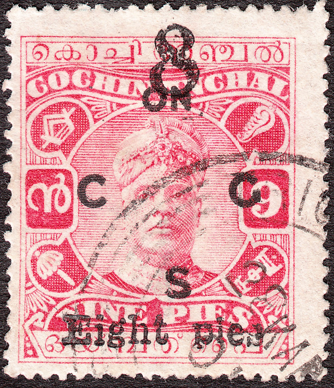 Die Freimarke Cochin MiNr. 29 wurde mit schwarzem Aufdruck "On C G S" sowie mit Aufdruck des neuen Wertes "8 Eight pies" versehen als Dienstmarke ausgegeben: