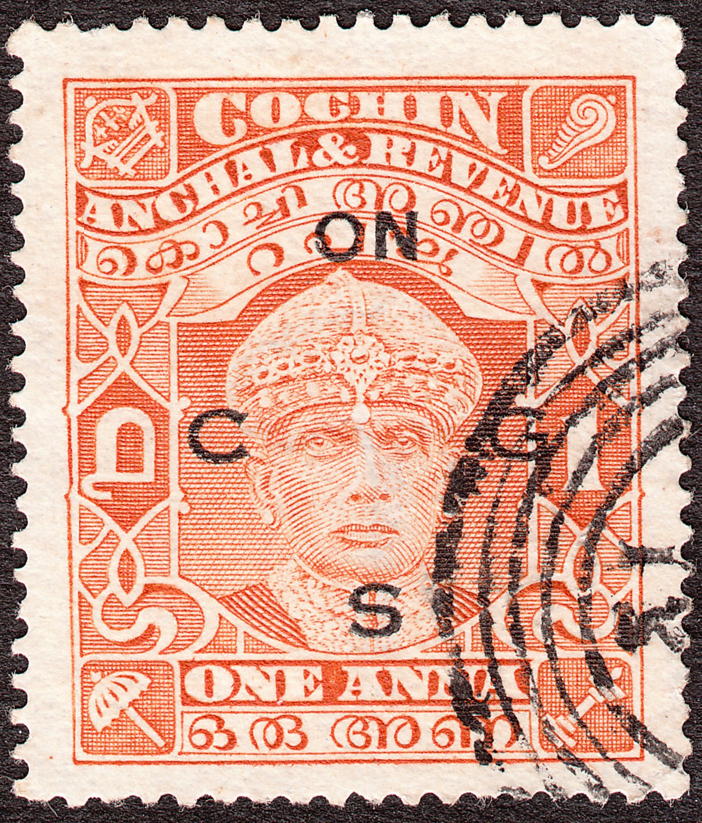 Die Freimarke Cochin MiNr. 45 wurde mit einem schwarzen Aufdruck "ON C G S" versehen als Dienstmarke ausgegeben: