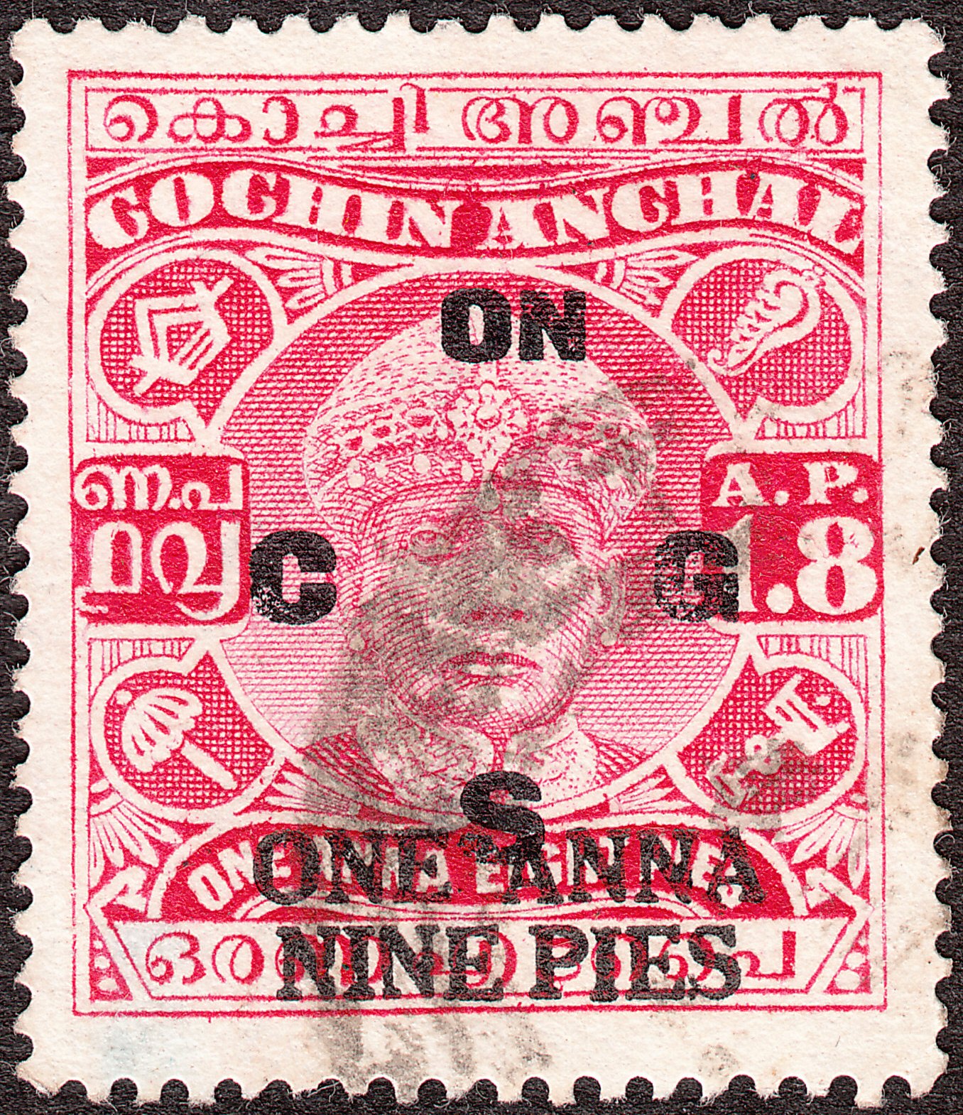 Die Dienstmarke Cochin MiNr. D 38 wurde mit schwarzem Aufdruck "ON C G S ONE ANNA NINE PIES" versehen als Dienstmarke ausgegeben: