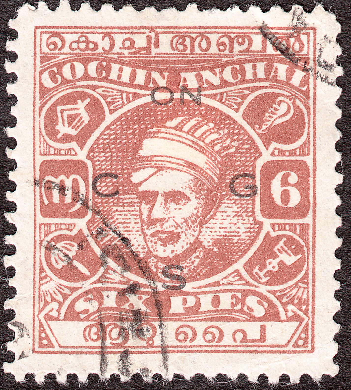 Die Freimarke Cochin MiNr. 71 wurde 1944 mit schwarzrem Aufdruck "ON C G S" versehen als Dienstmarke ausgegeben: