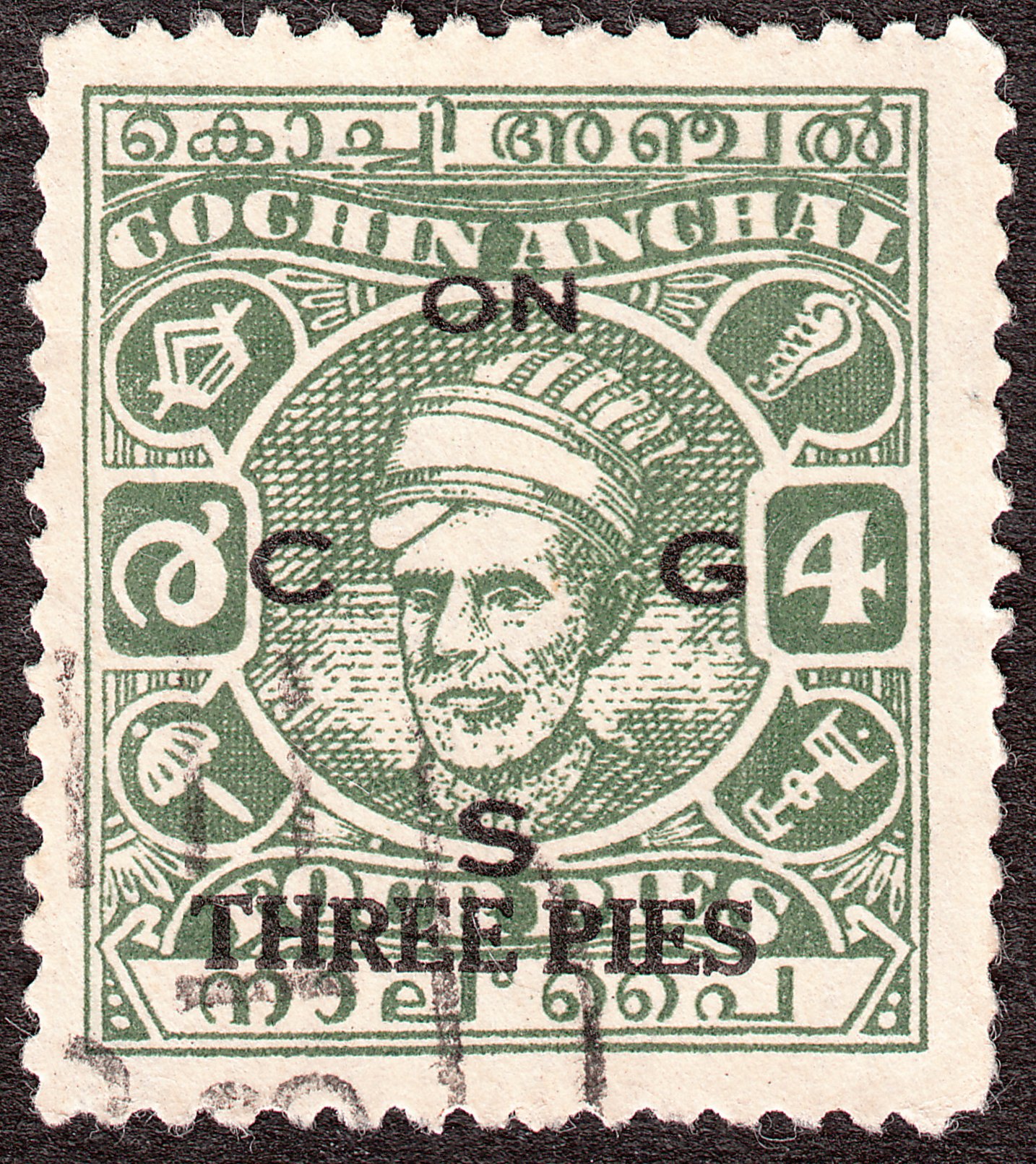 Die Freimarke Cochin MiNr. 70 der Wertstufe 4 Pies wurde mit schwarzem Aufdruck "ON C G S" zur Dienstmarke Cochin MiNr. D 69. Mit einem weiteren schwarzen Aufdruck "THREE PIES" versehen wurde daraus dann diese Dienstmarke Cochin MiNr. D 75 II: