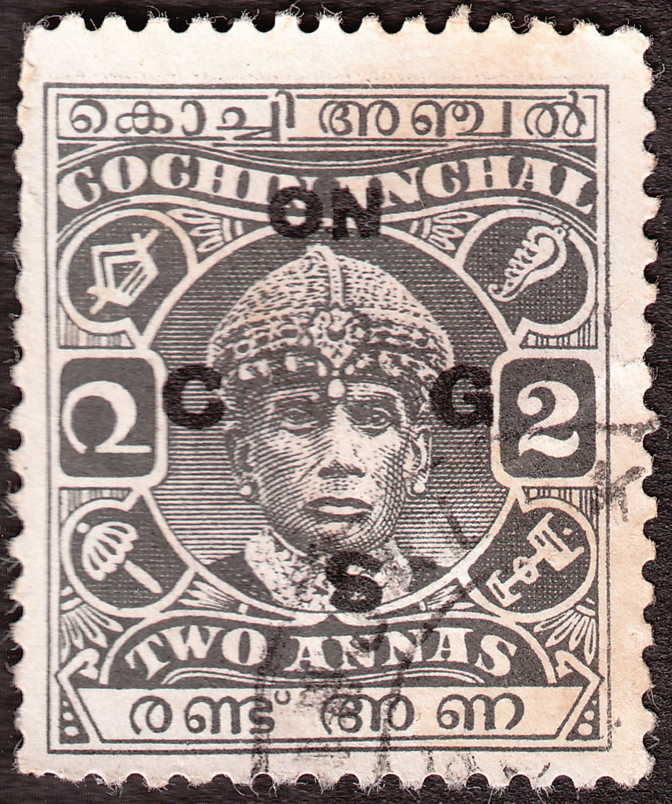 Die Freimarke Cochin MiNr. 47 wurde mit einem schwarzen Aufdruck "ON C G S" versehen als Dienstmarke ausgegeben: