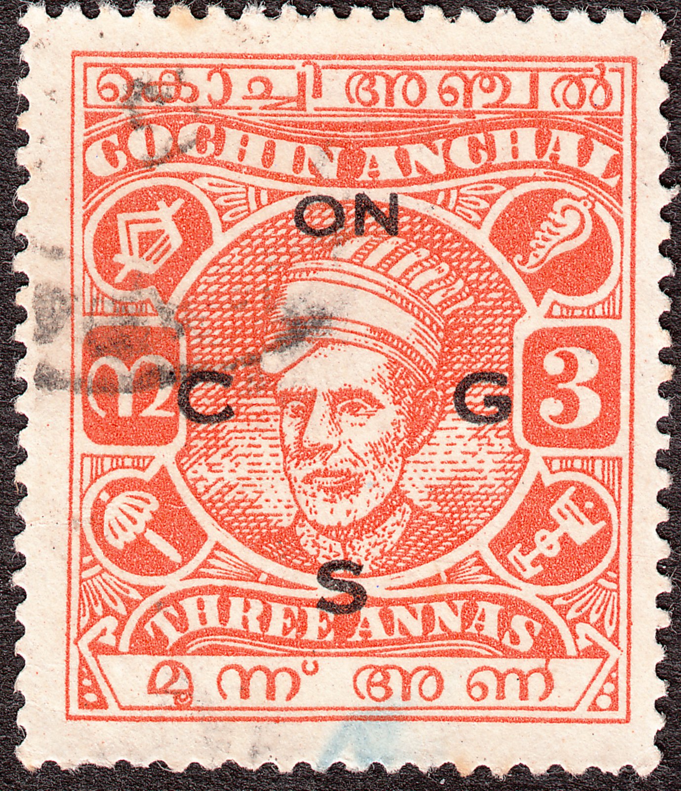 Dieser als Freimarke nicht ausgegebene Wert aus Cochin der Wertstufe 3 Annas in der Zähnung 13 : 13 1/2 wurde mit schwarzem Aufdruck "ON C G S" zur Dienstmarke Cochin MiNr. D 74 C: