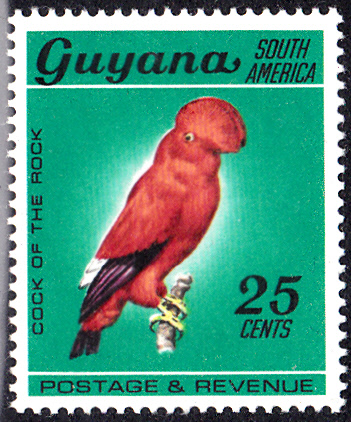Diese Marke aus Guyana (MiNr 309) zeigt ein Männchen des Tiefland-Felsenhahns (Rupicola rupicola). Im Michel wird dieser Vogel Orange-Felsenhahn (Rupicola rupicola) genannt.