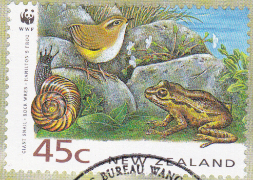 Auf einer Marke aus Neuseeland (MiNr 1292) sehen wir eine Riesenschnecke, einen Felsenstummelschwanz (Xenicus gilviventris) und einen Hamilton-Frosch (Leiopelma hamiltoni). Michel nennt fälschlicherweise den Namen Felsschlüpfer (Salpinctes obsoletus), das wäre aber der oben erwähnte Felsenzaunkönig.