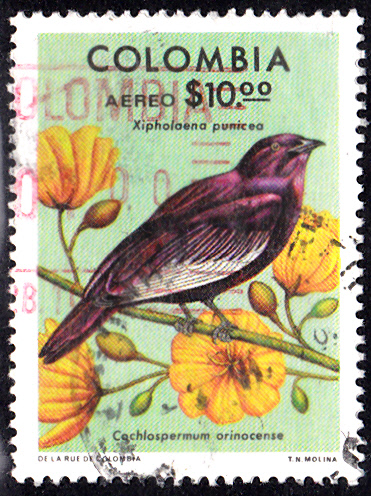 Hier eine Marke aus Kolumbien (MiNr 1337) mit einem Pompadourpurpurvogel (Xipholena punicea).