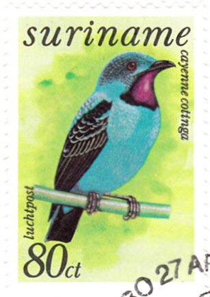 Aus Surinam kommt diese Marke (MiNr 769) mit einer Türkisblauen Kotinga (Cotinga cayana).