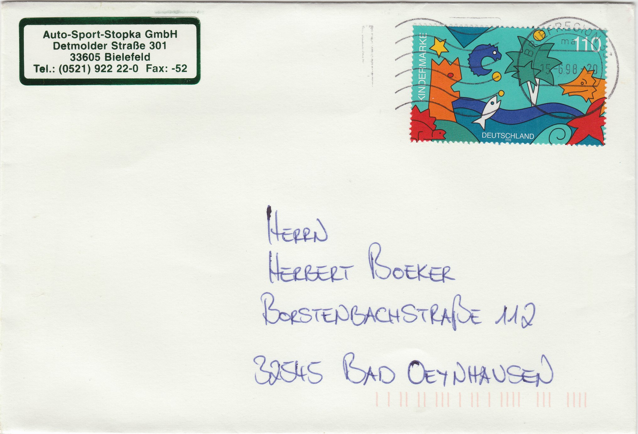 Hier ein Beispiel vom 15.06.1998 von der BRIEFREGION 33 mit einem Absender aus 33605 Bielefeld: