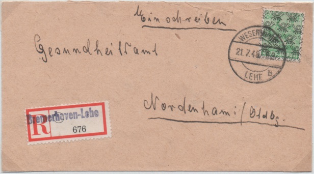 Wesermünde und das Motiv der verwendeten Briefmarken belegen die Zeit vor dem Ende des Zweiten Weltkriegs. Trotzdem lauten sowohl Stempel als auch Paketaufkleber auf
