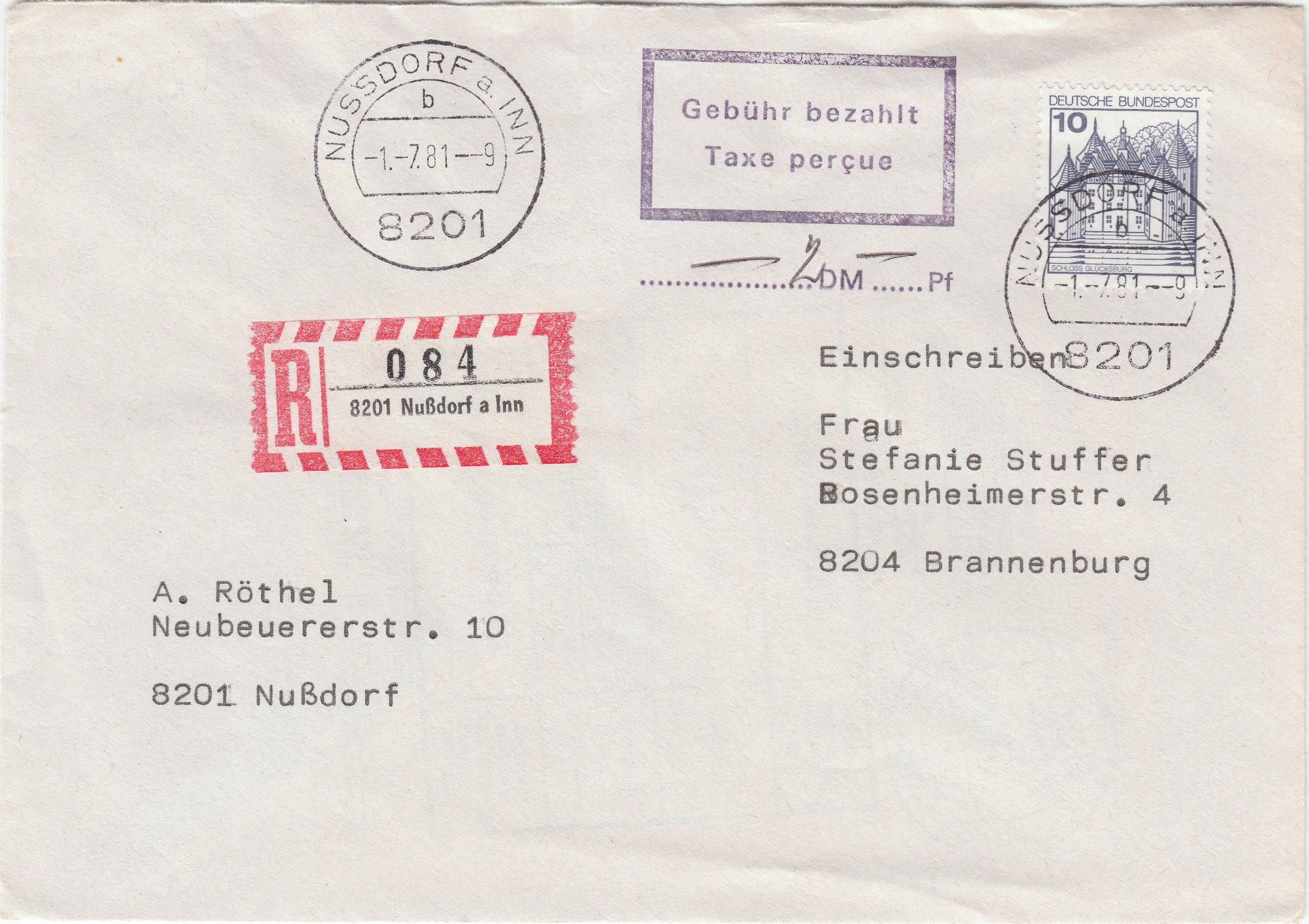 Ein Standardbrief kostete am 01.07.1981 60 Pf Porto, Einschreiben 150 Pf. Der Absender hatte nur 10 Pf verklebt und gab diesen Beleg in Nußdorf am Inn am Postschalter auf.