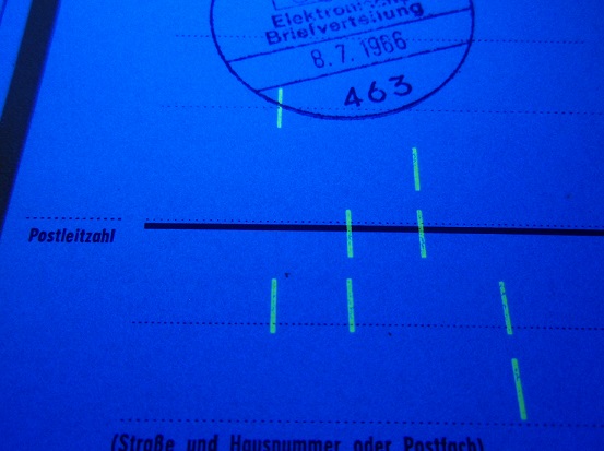 die Anordnung der (weiß erscheinenden) Codierstreifen entspricht der auf dem Muster im Zudruck. Ob das wirklich die codierte Anschrift ist?