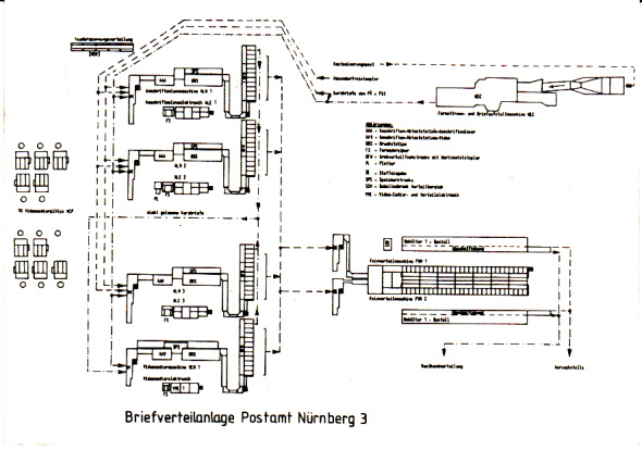 Bei der Briefverteilanlage beim Postamt Nürnberg 3 wurde zunächst ab 21.08.1985 ein Probebetrieb aufgenommen. Den ersten Tag des Probebetriebes belegt diese Karte. Auf der Rückseite ist eine Skizze der Verteilanlage abgebildet.