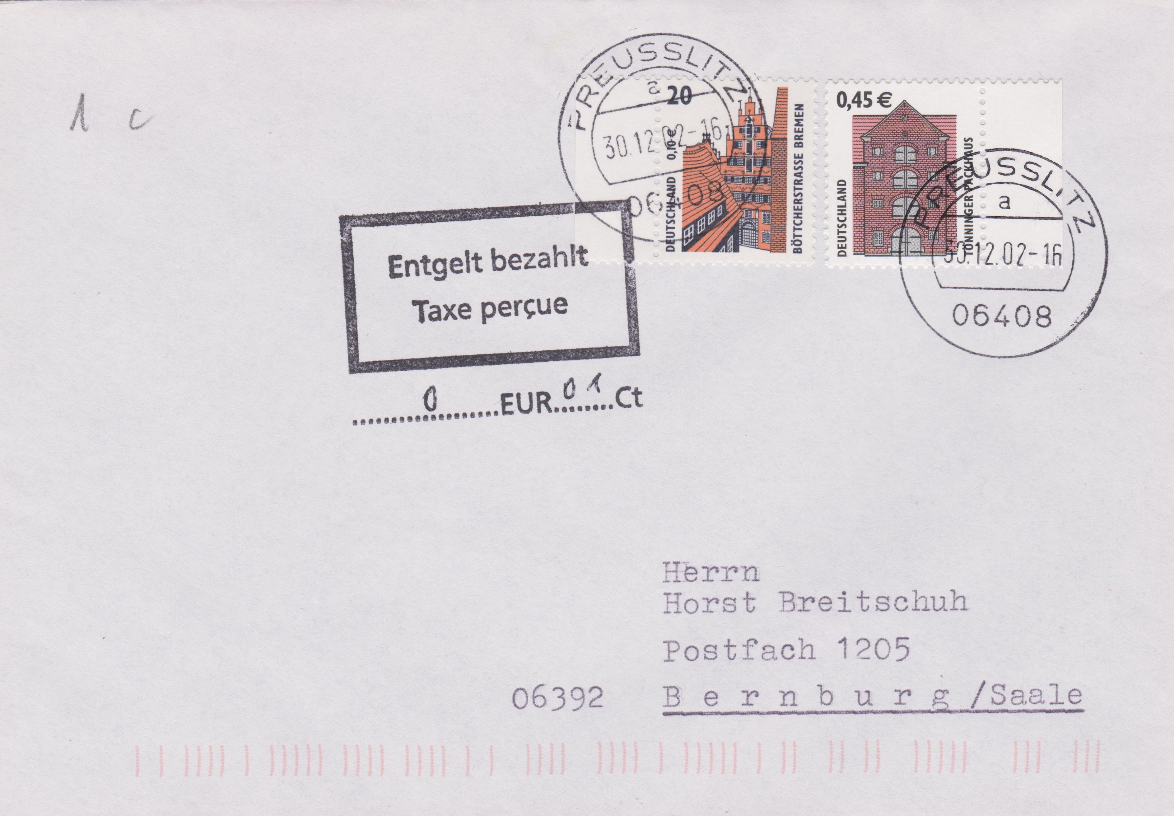 Freimarke "Sehenswürdigkeiten" der Ausgabe XXXI 0,45 € vom rechten Bogenrand, am 30.12.2002 als Mischfrankatur mit Doppelnominale "20 Pf/0,10 €" auf Brief verklebt: